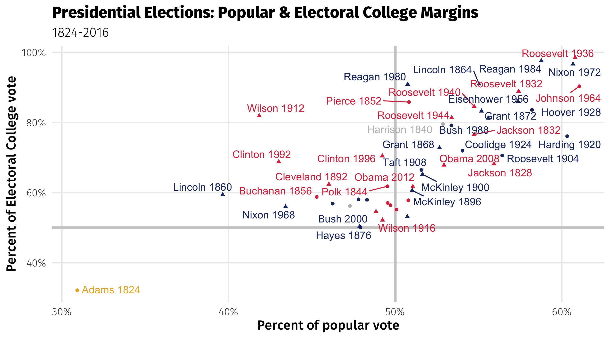% of popular vote (x-axis, popular_pct) and % of electoral college vote (y-axis, ec_pct)