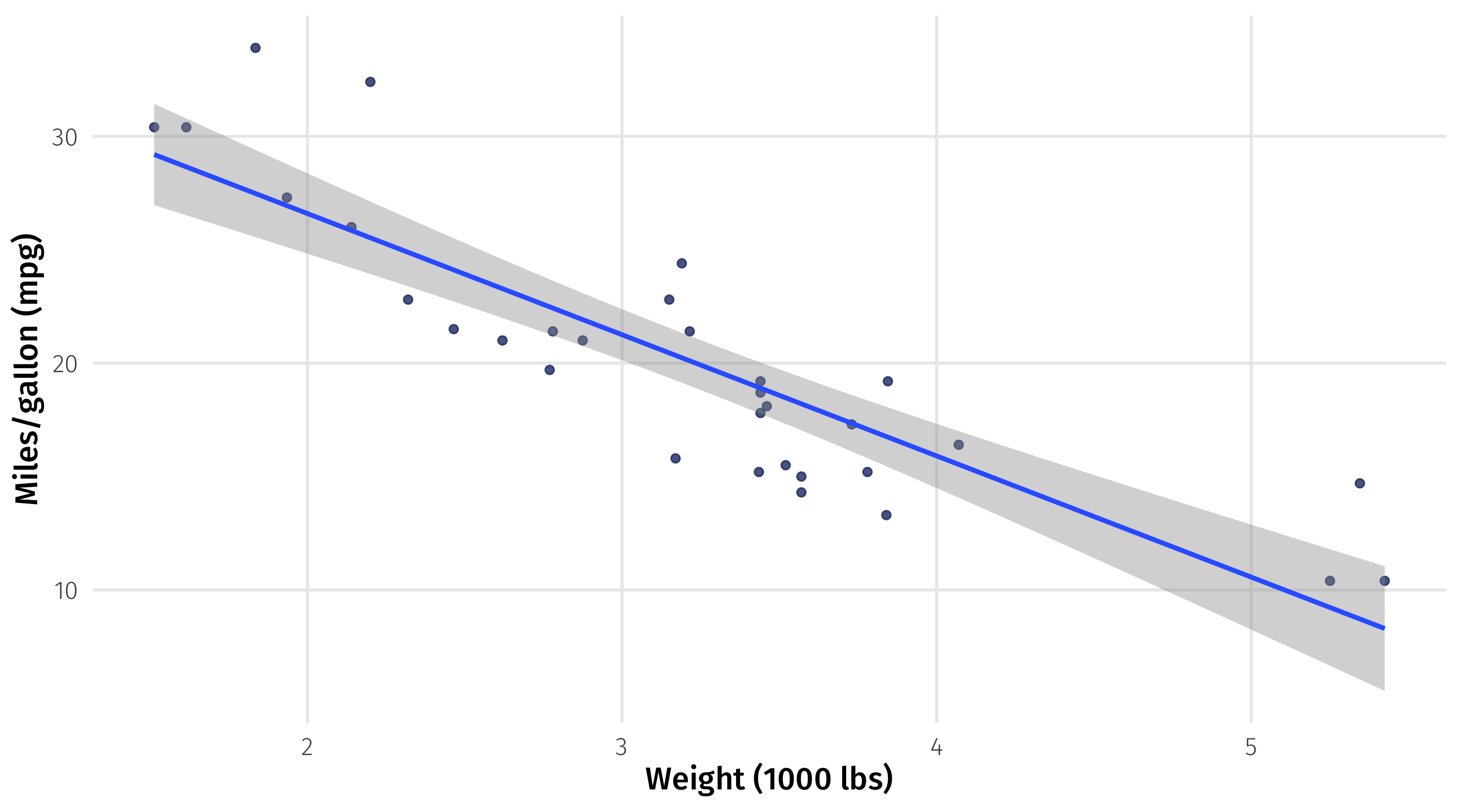 Specific: for every ton of weight you add to a car, you lose \(\color{red}{5.3}\) miles per gallon of fuel efficiency