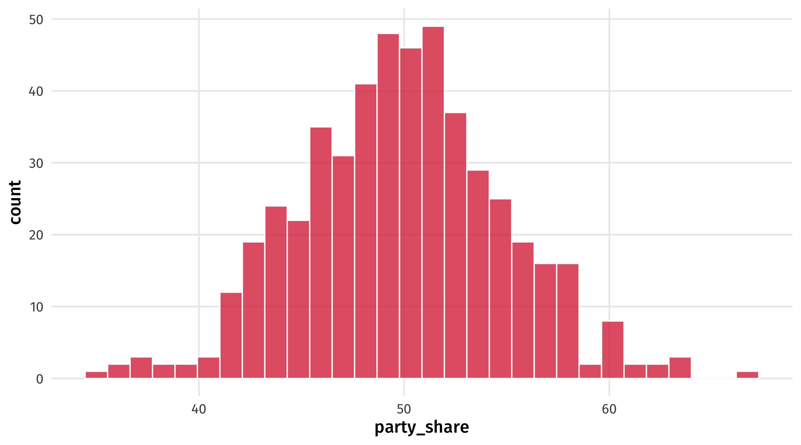fake_election = tibble(party_share = rnorm(n = 500, mean = 50, sd = 5),