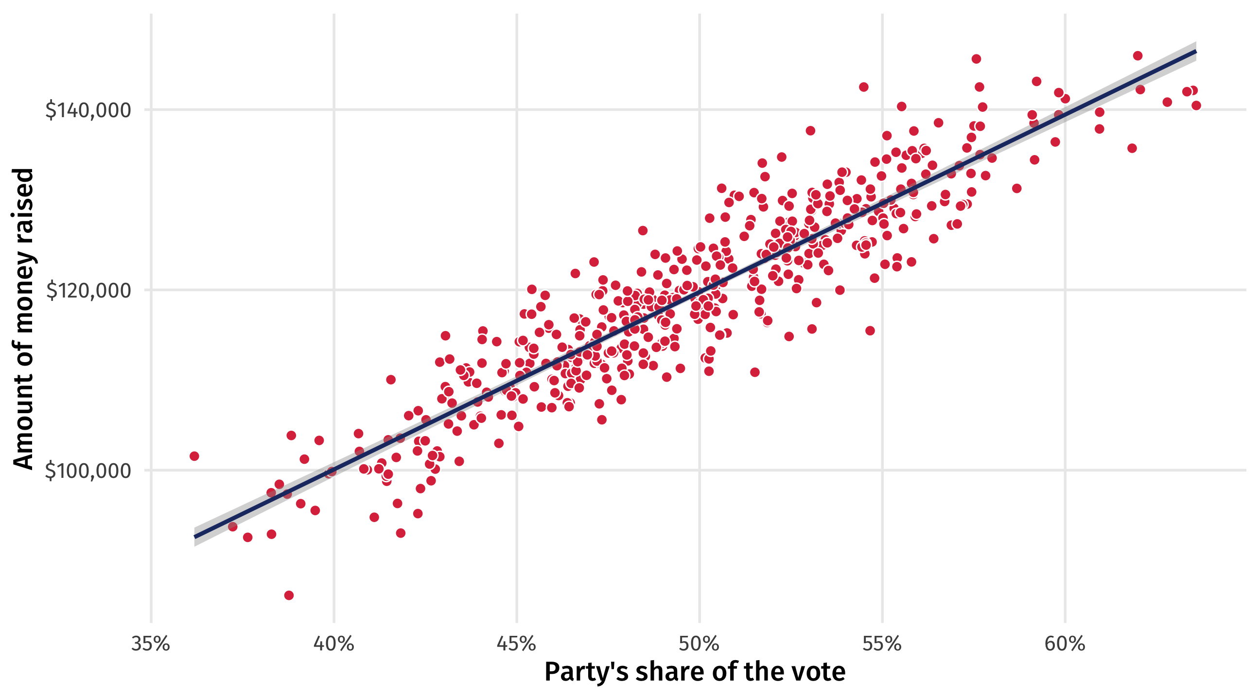 funding = rnorm(n = 500, mean = 20000, sd = 4000) + 2000 * party_share)