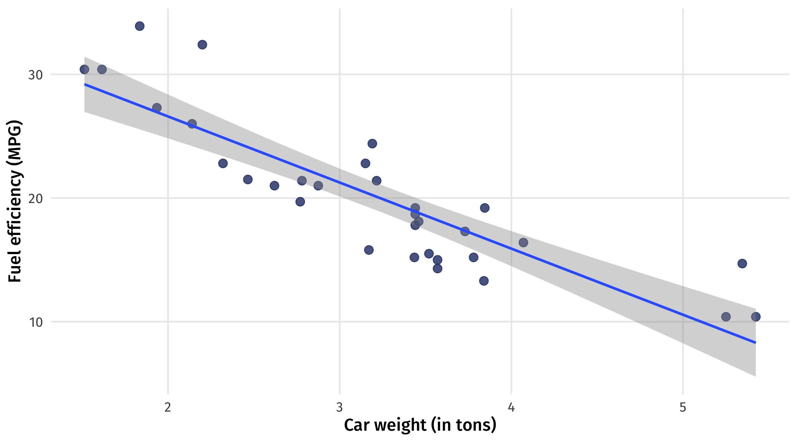 Make a scatterplot with a trend line – use labs() to help us make sense of the plot axes!