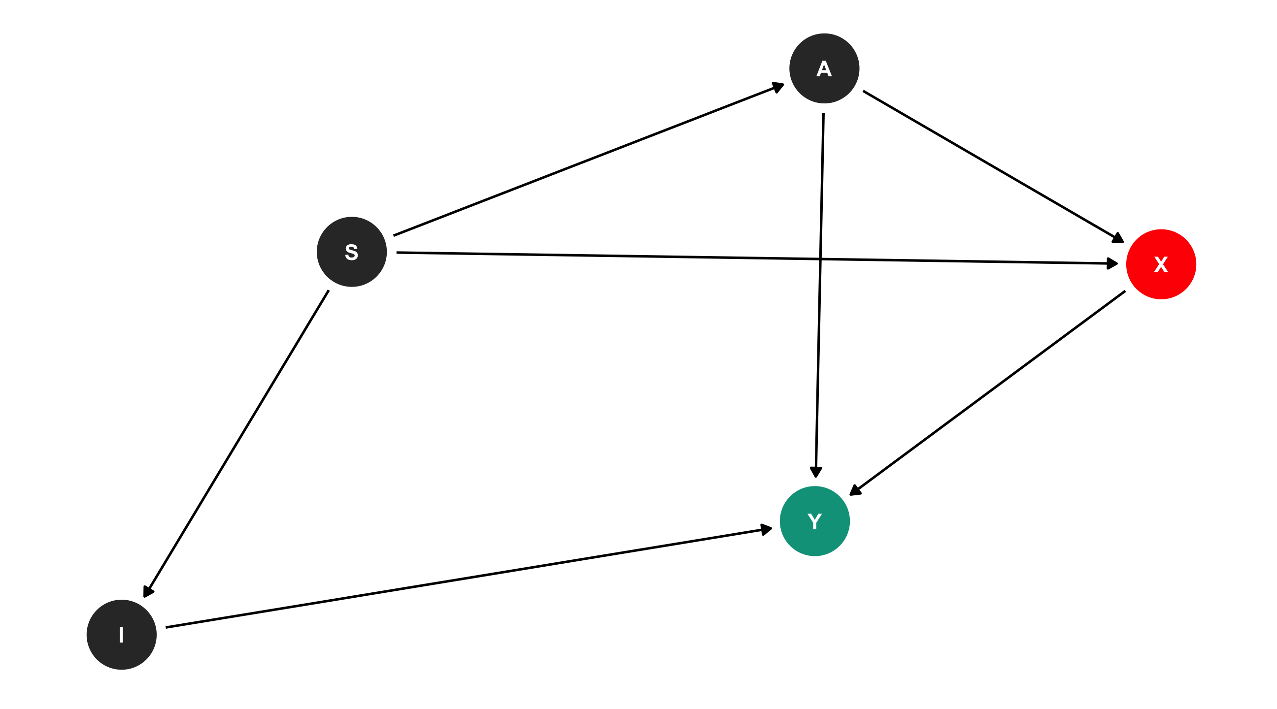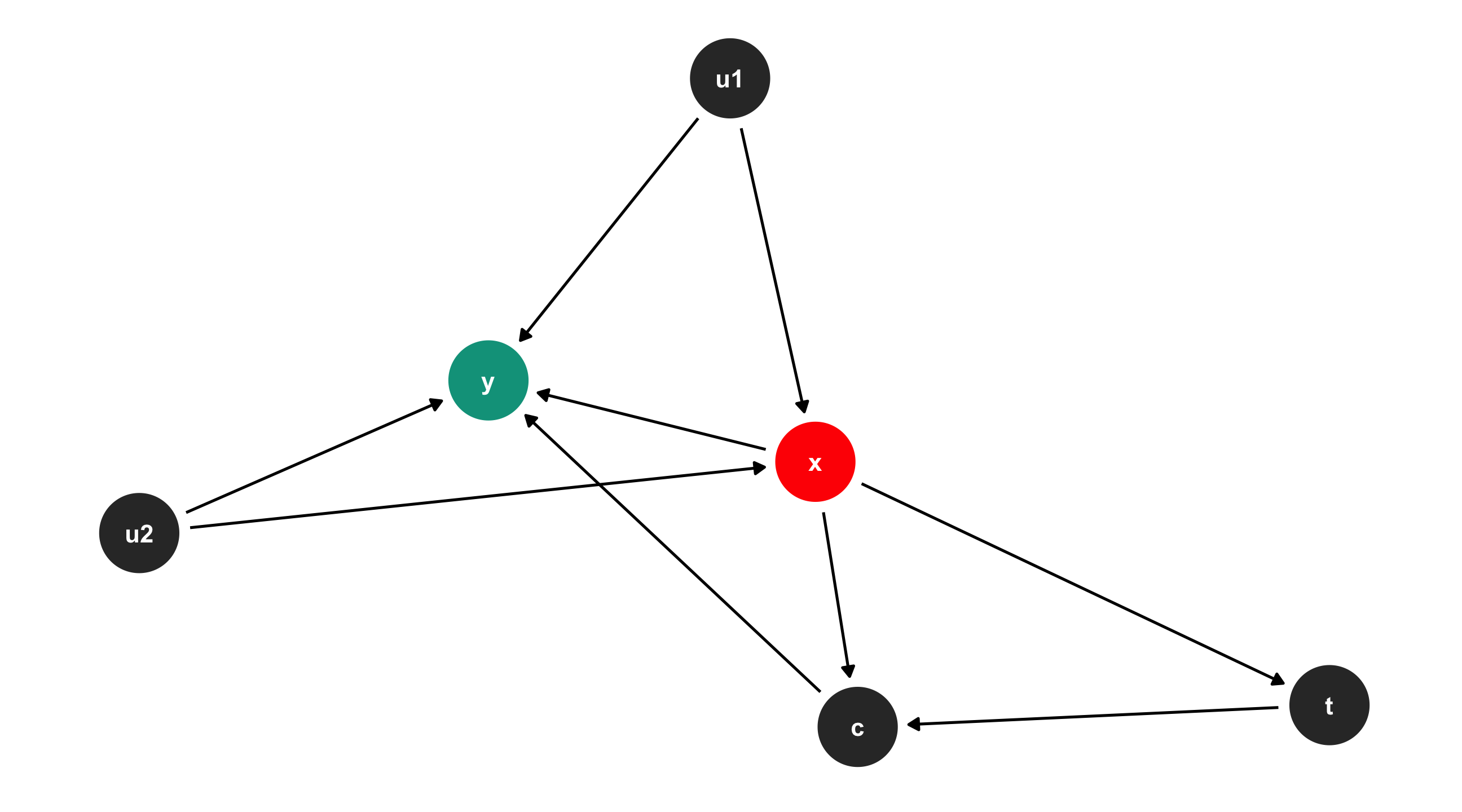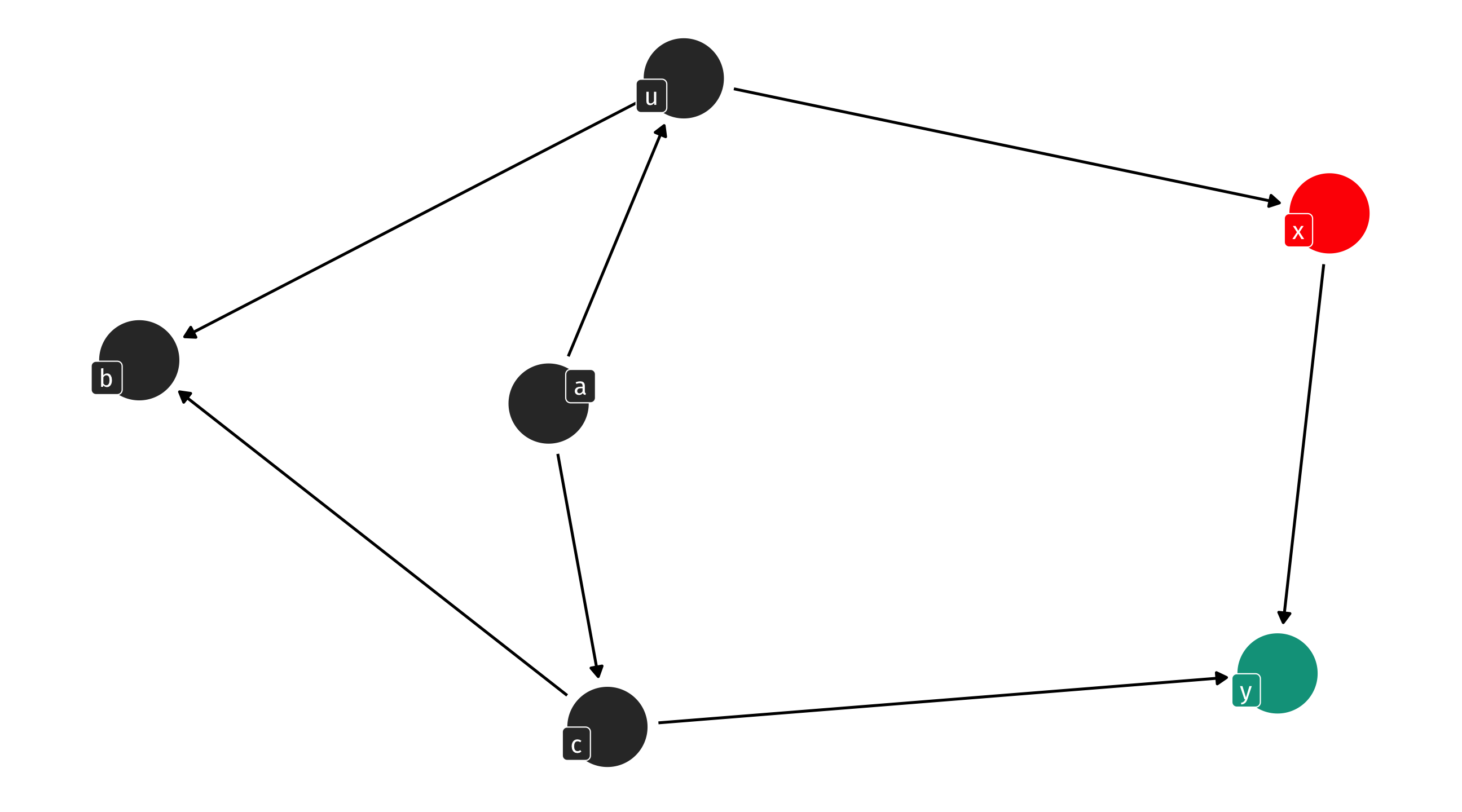 We can identify X \(\rightarrow\) Y by controlling for any variable in the backdoor path to break the chain: m, a, or b