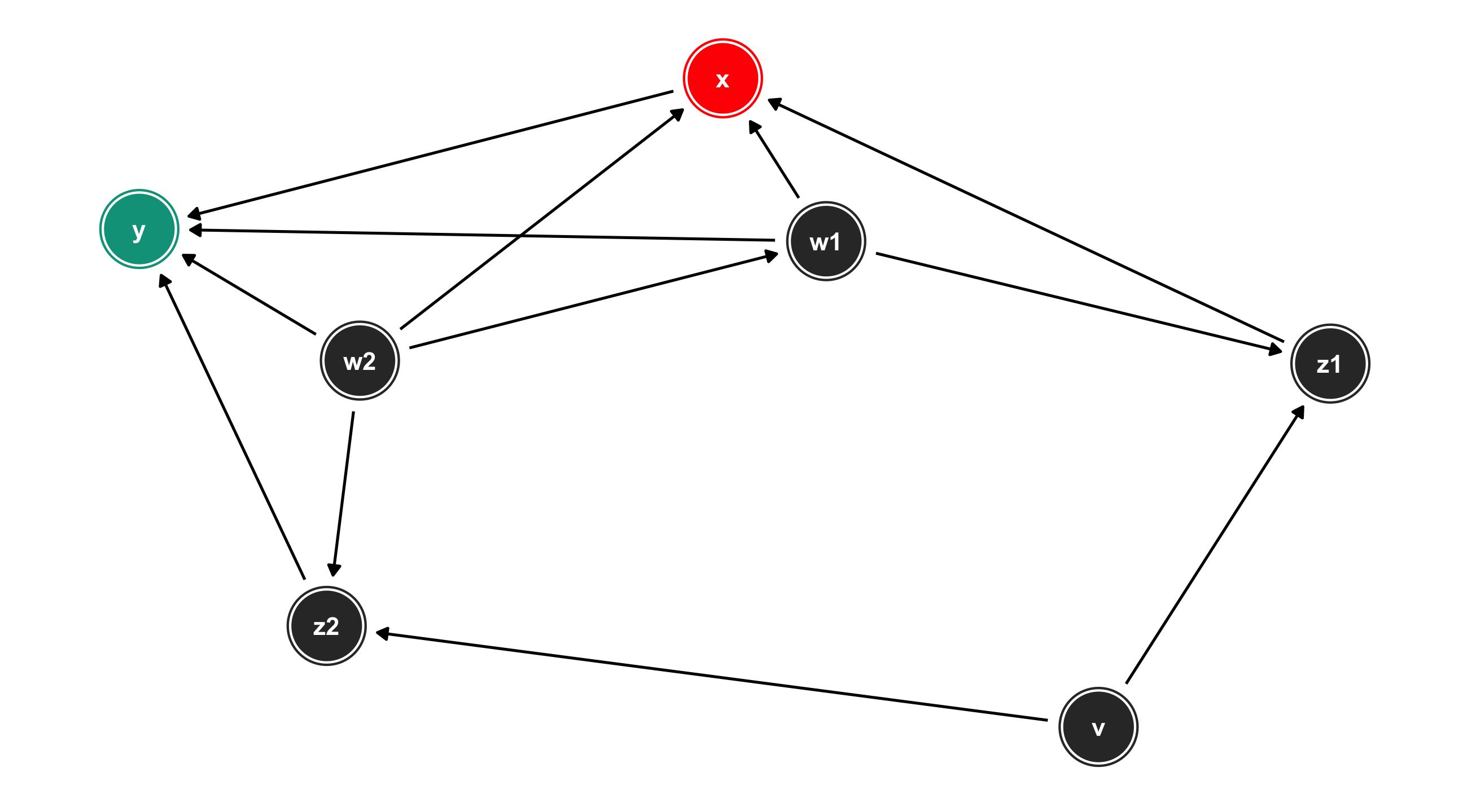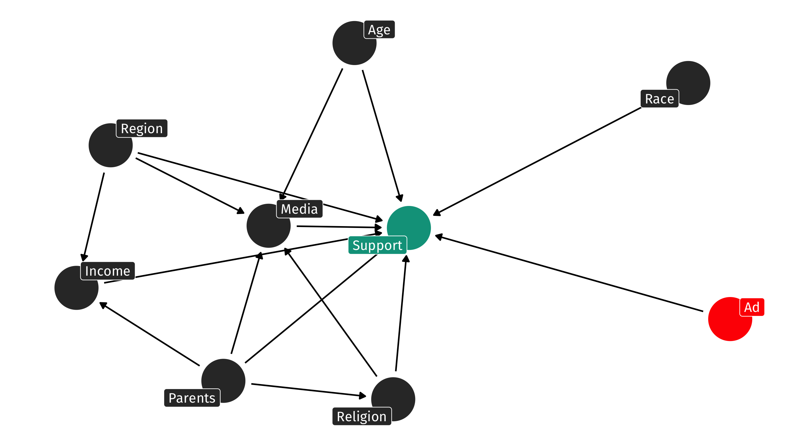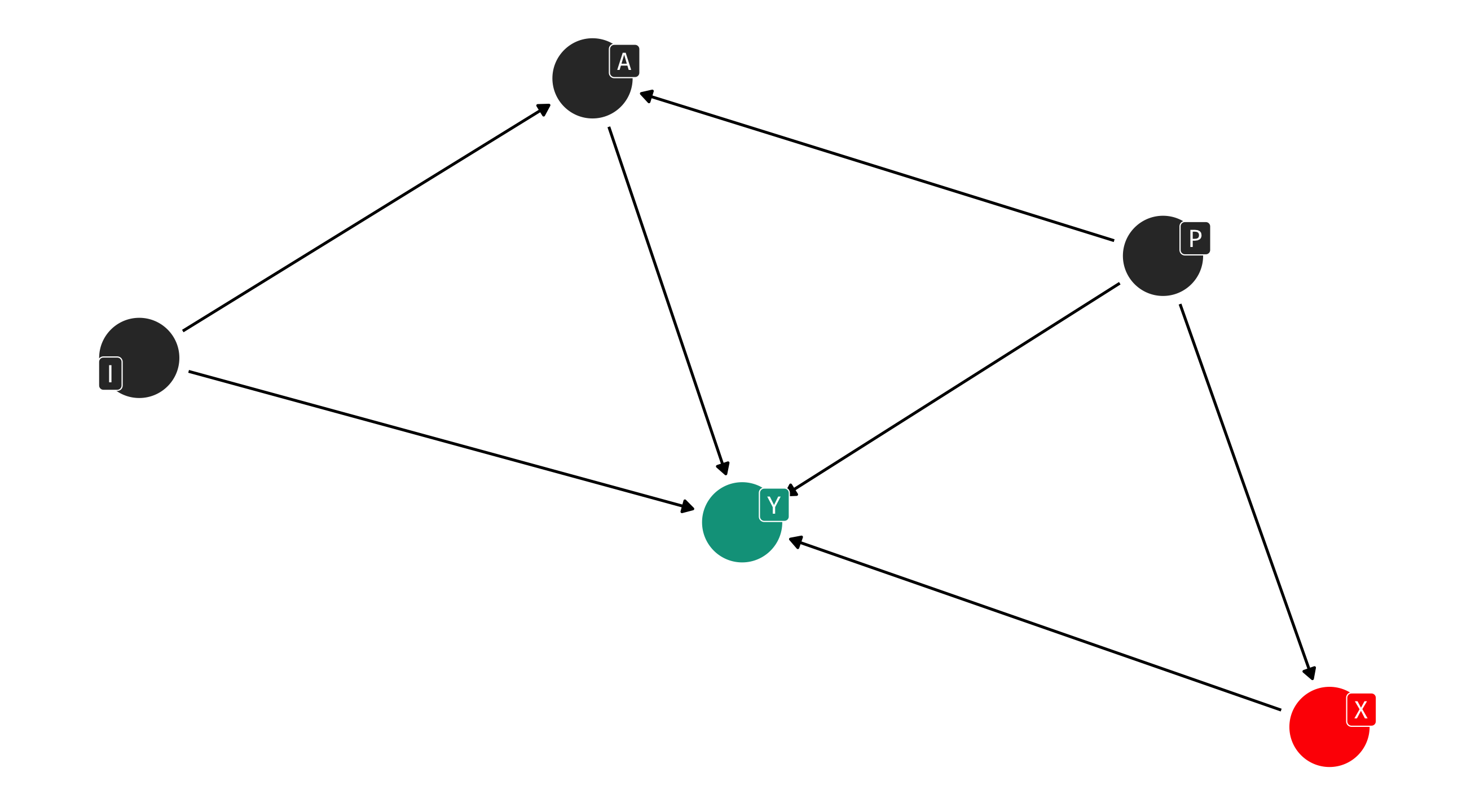 We can identify X \(\rightarrow\) Y by controlling for any variable in the backdoor path to break the chain: m, a, or b