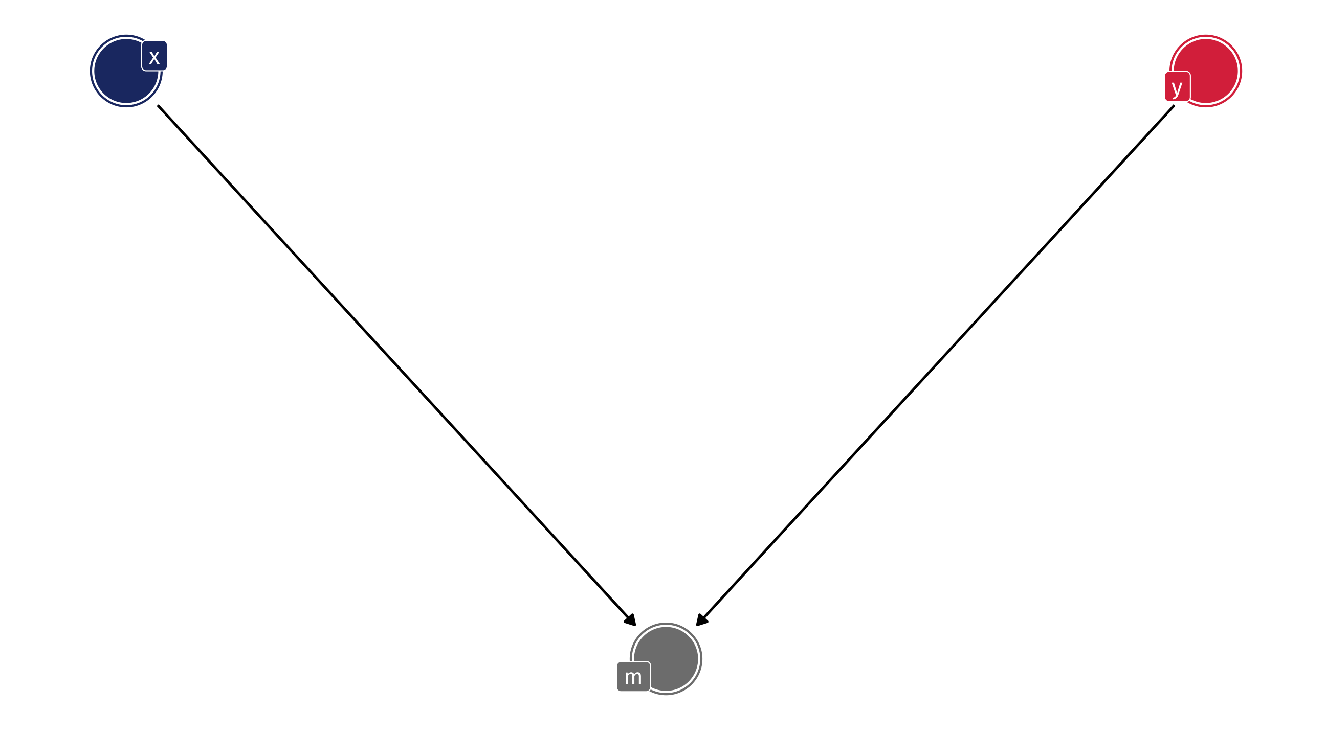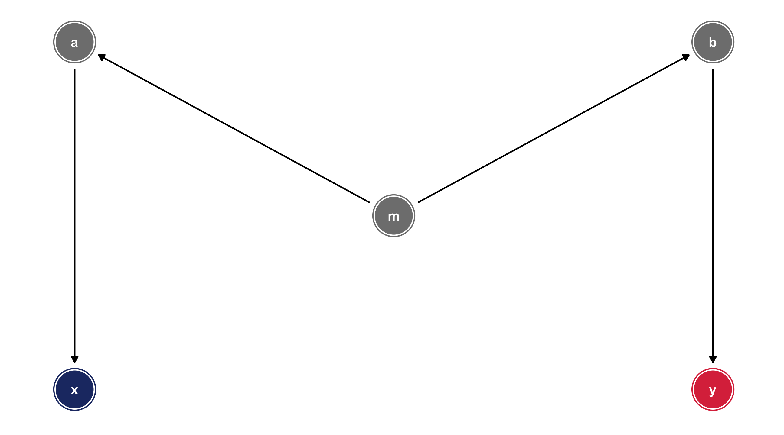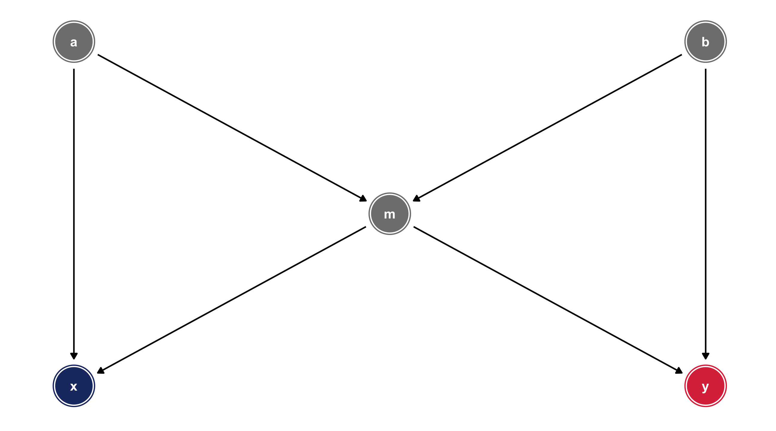 Here we have a backdoor path between X and Y that runs through a, b, and m