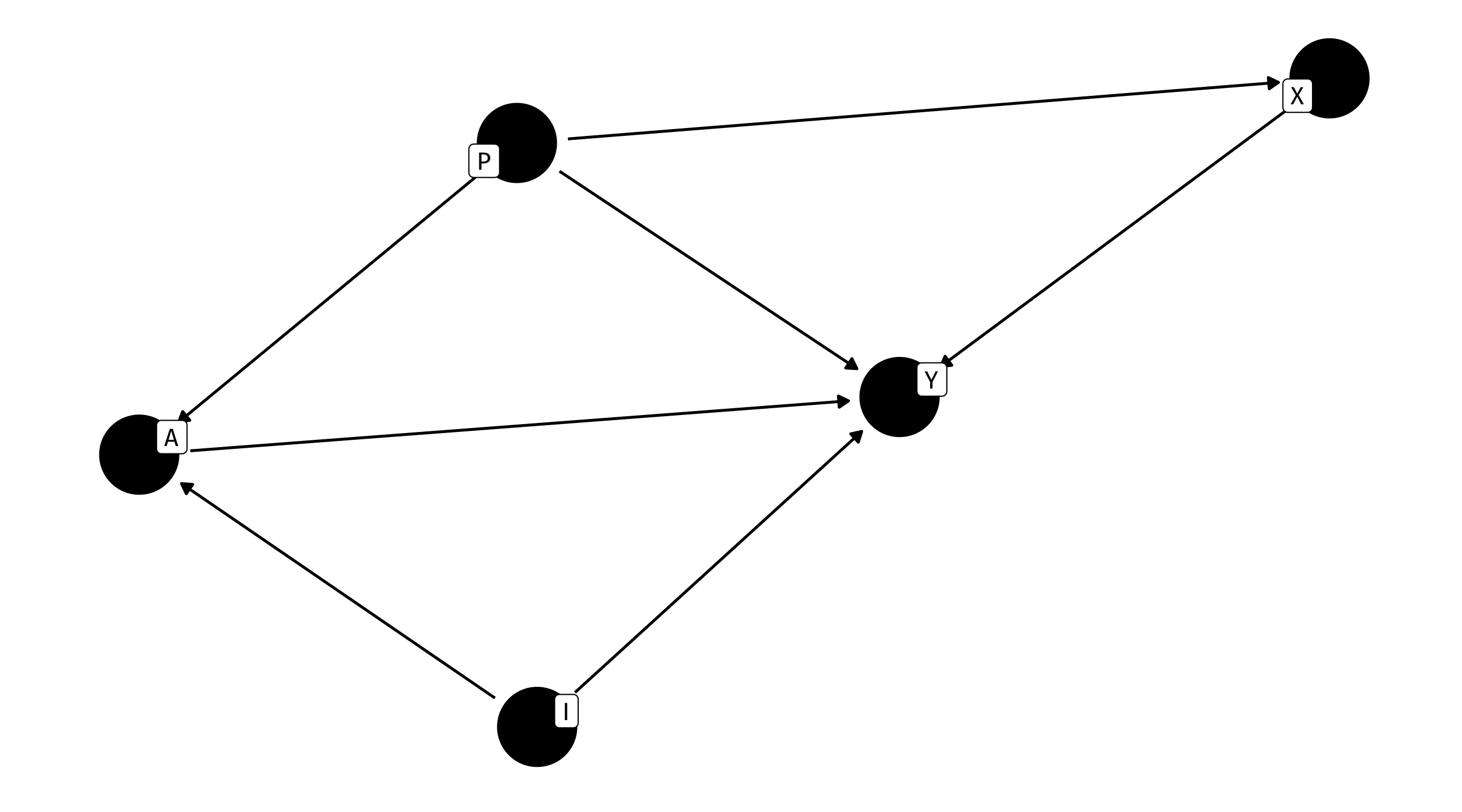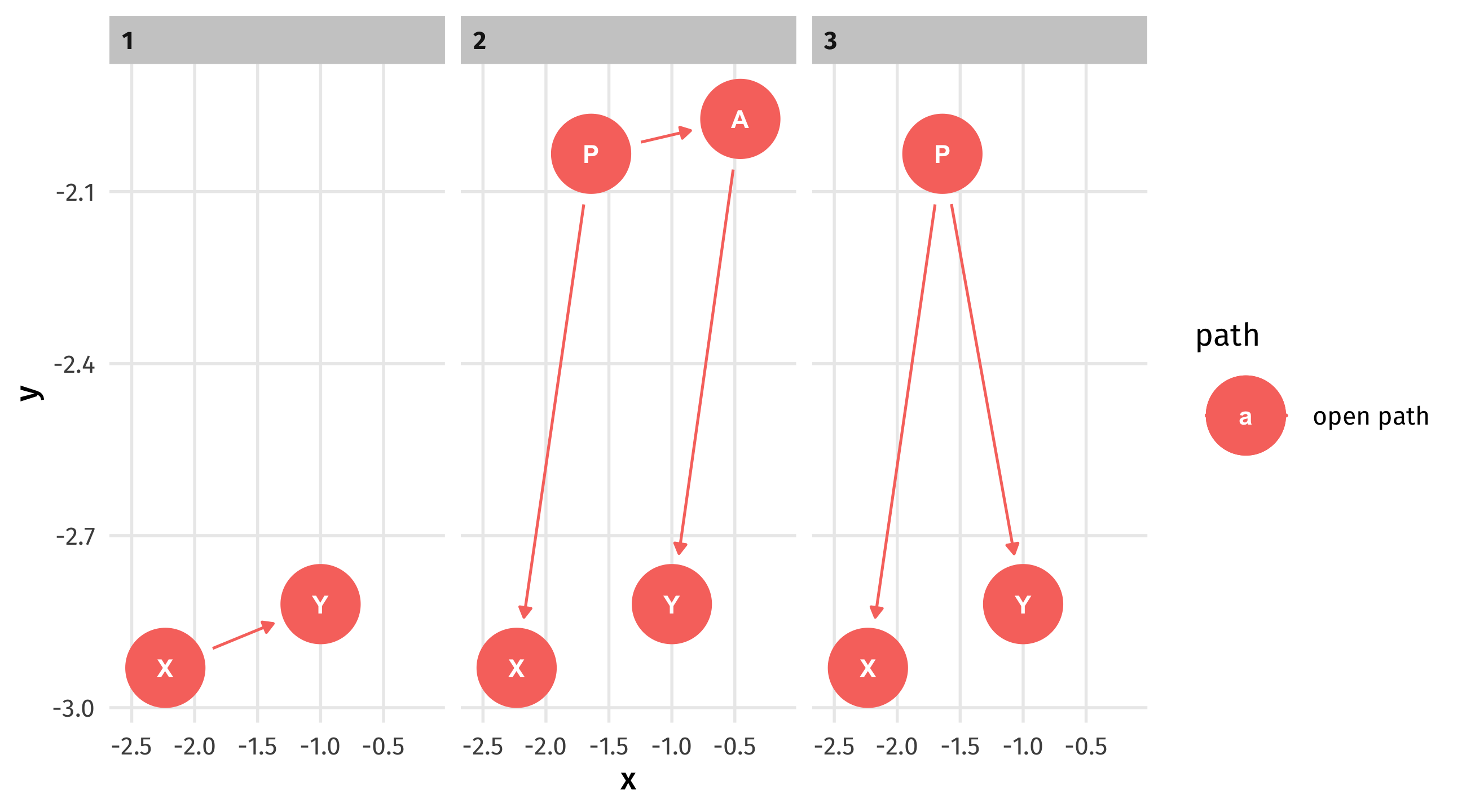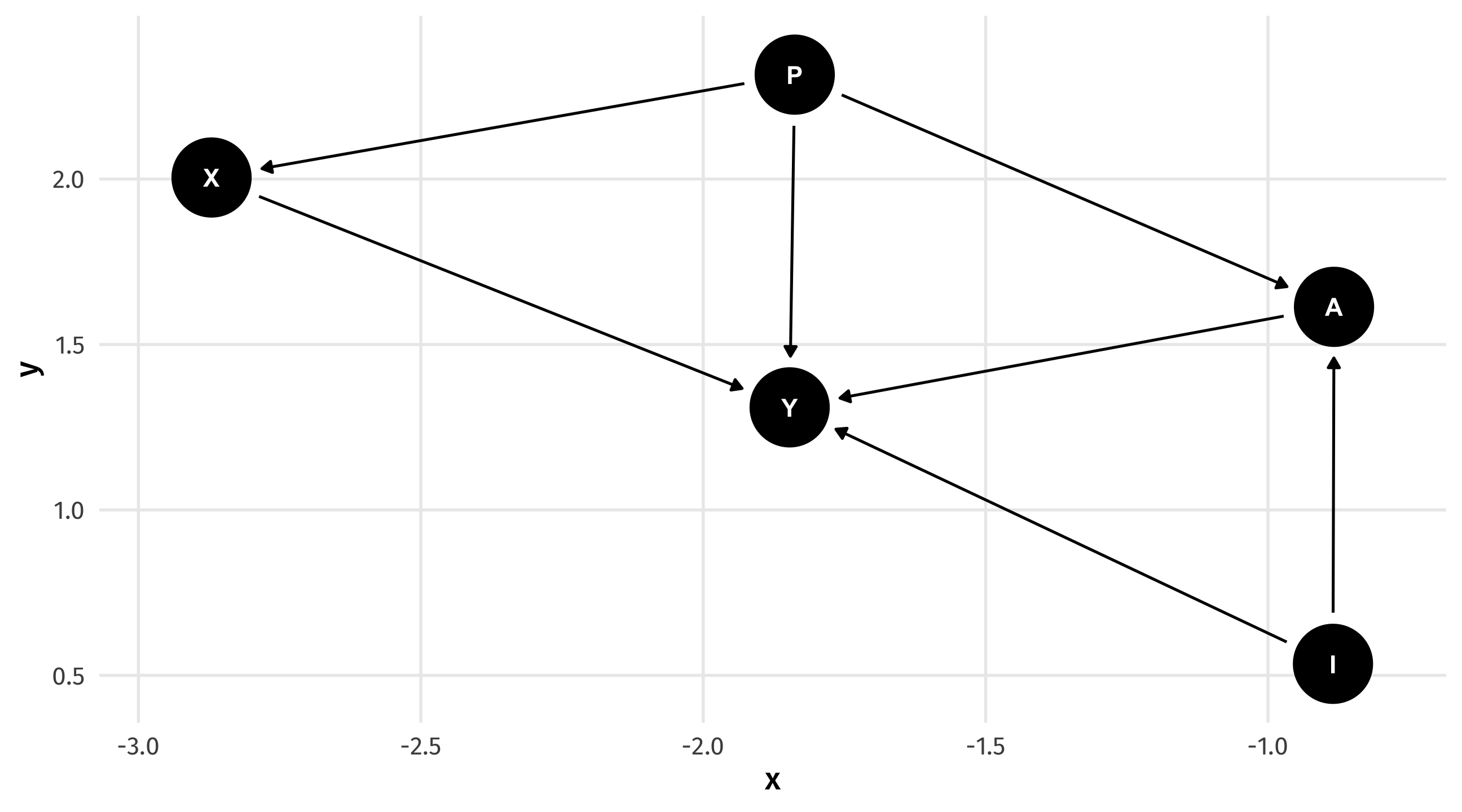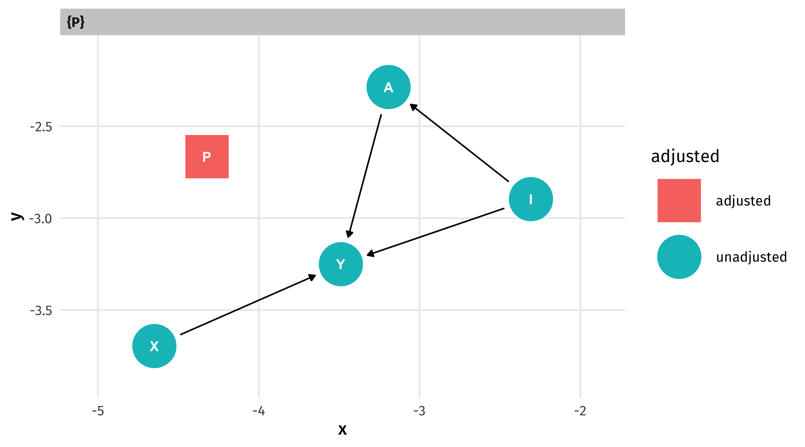 We identify what to control for using ggdag_adjustment_set (in this case P):