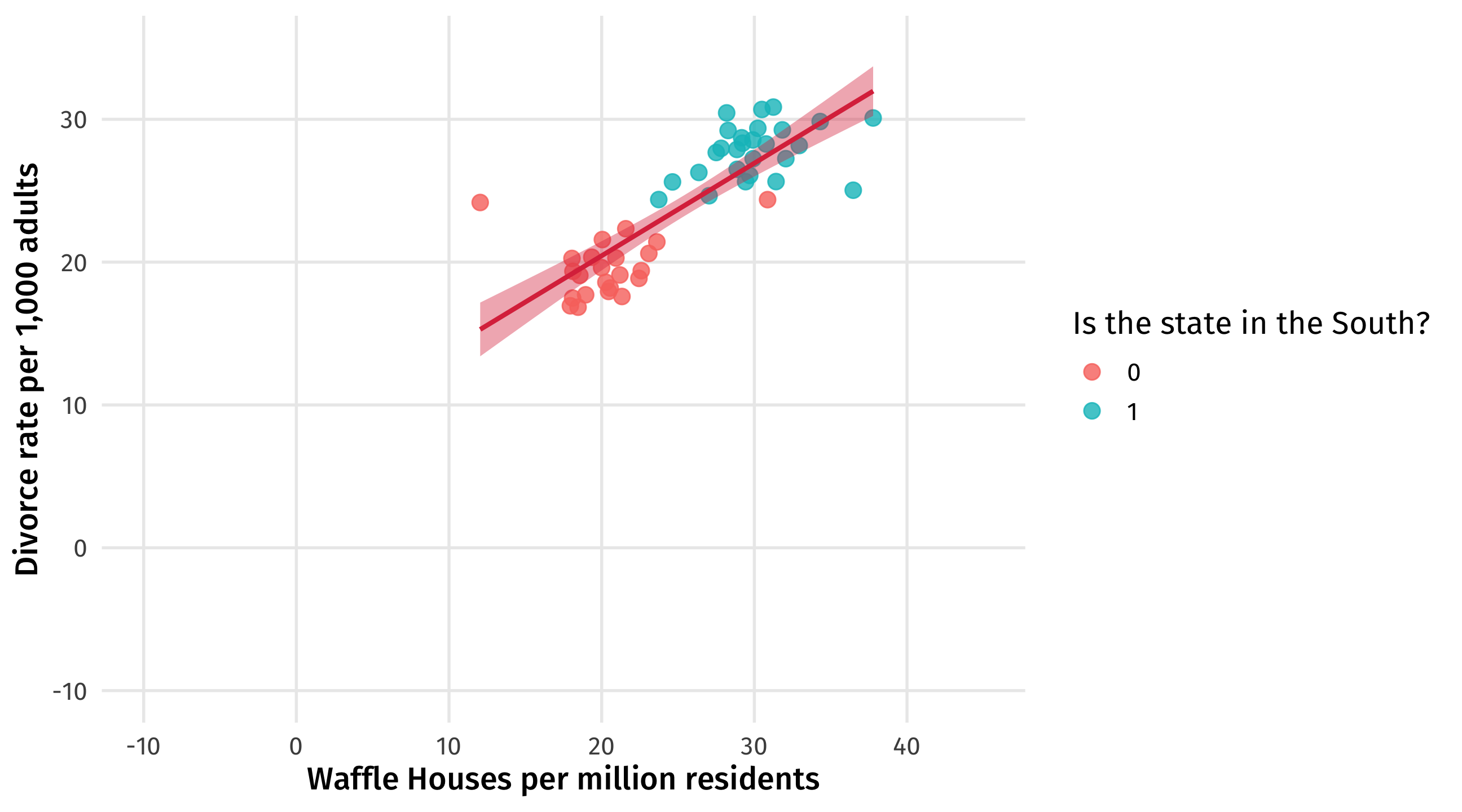 Remember, we have strong reason to believe the South is confounding the relationship between Waffle Houses and divorce rates: