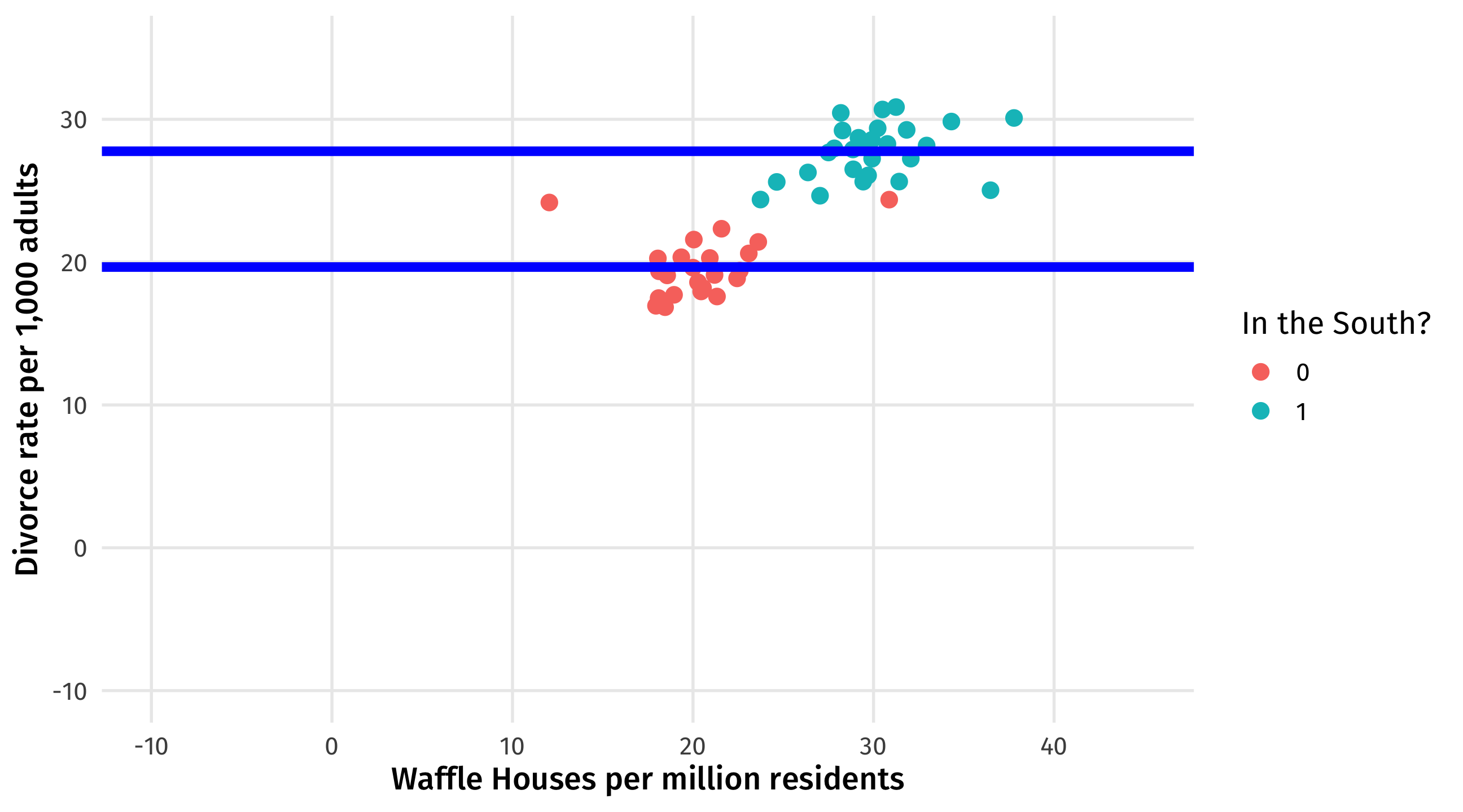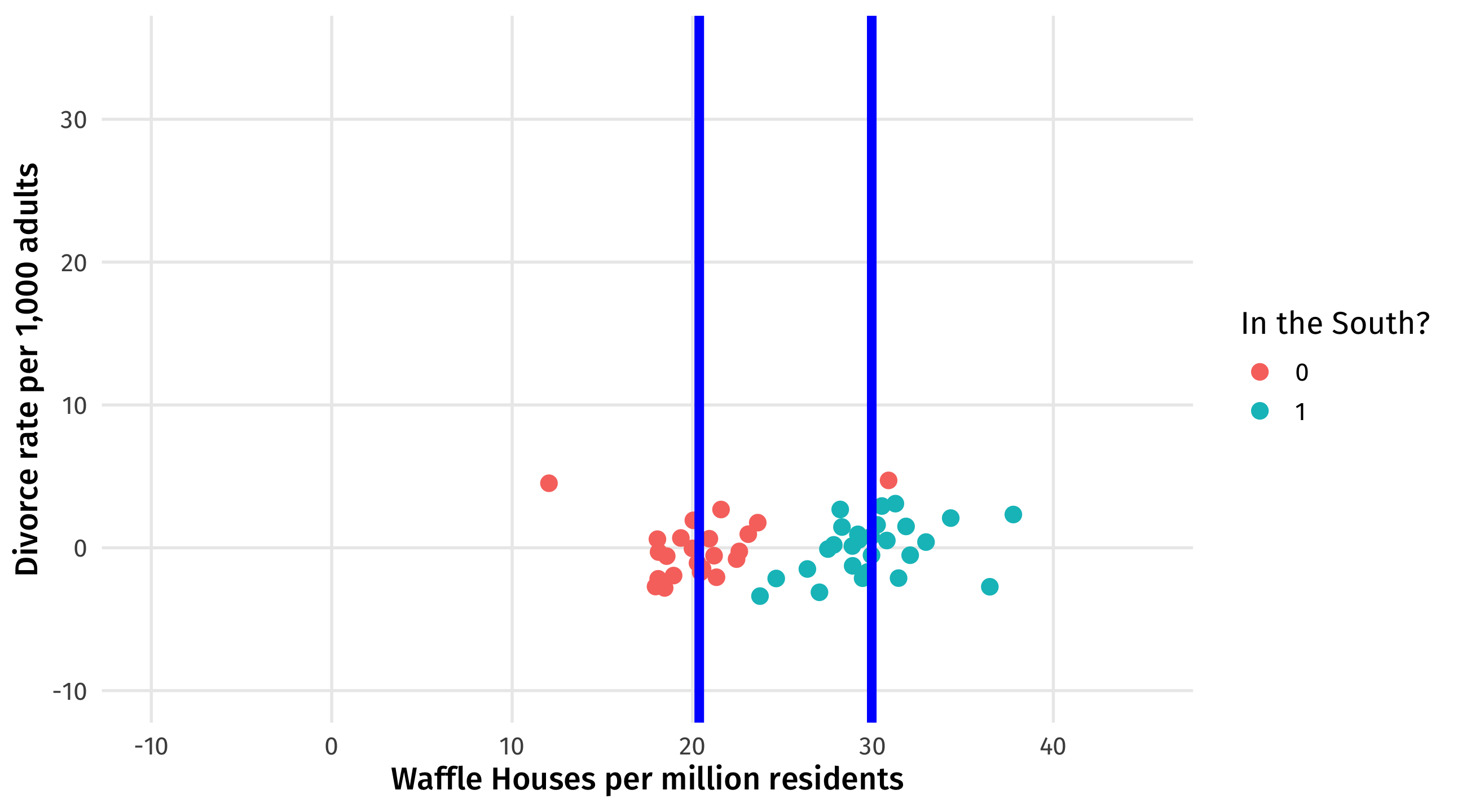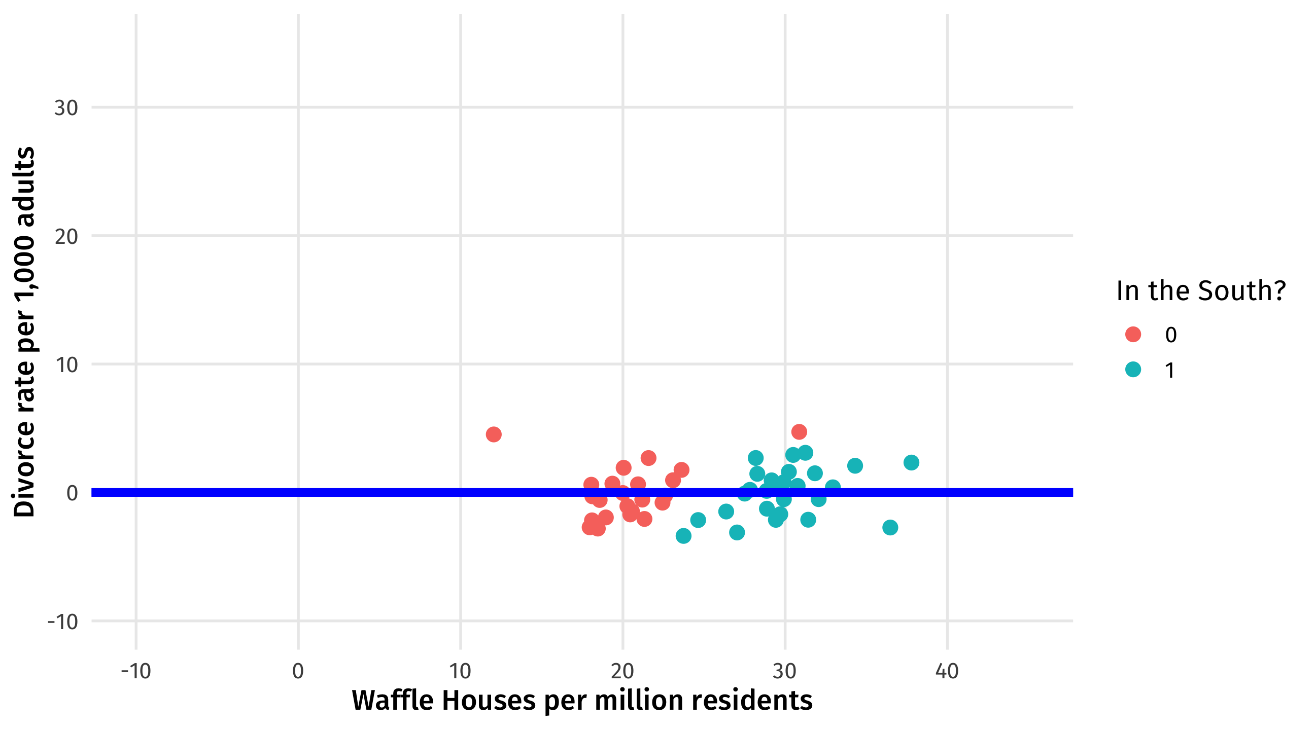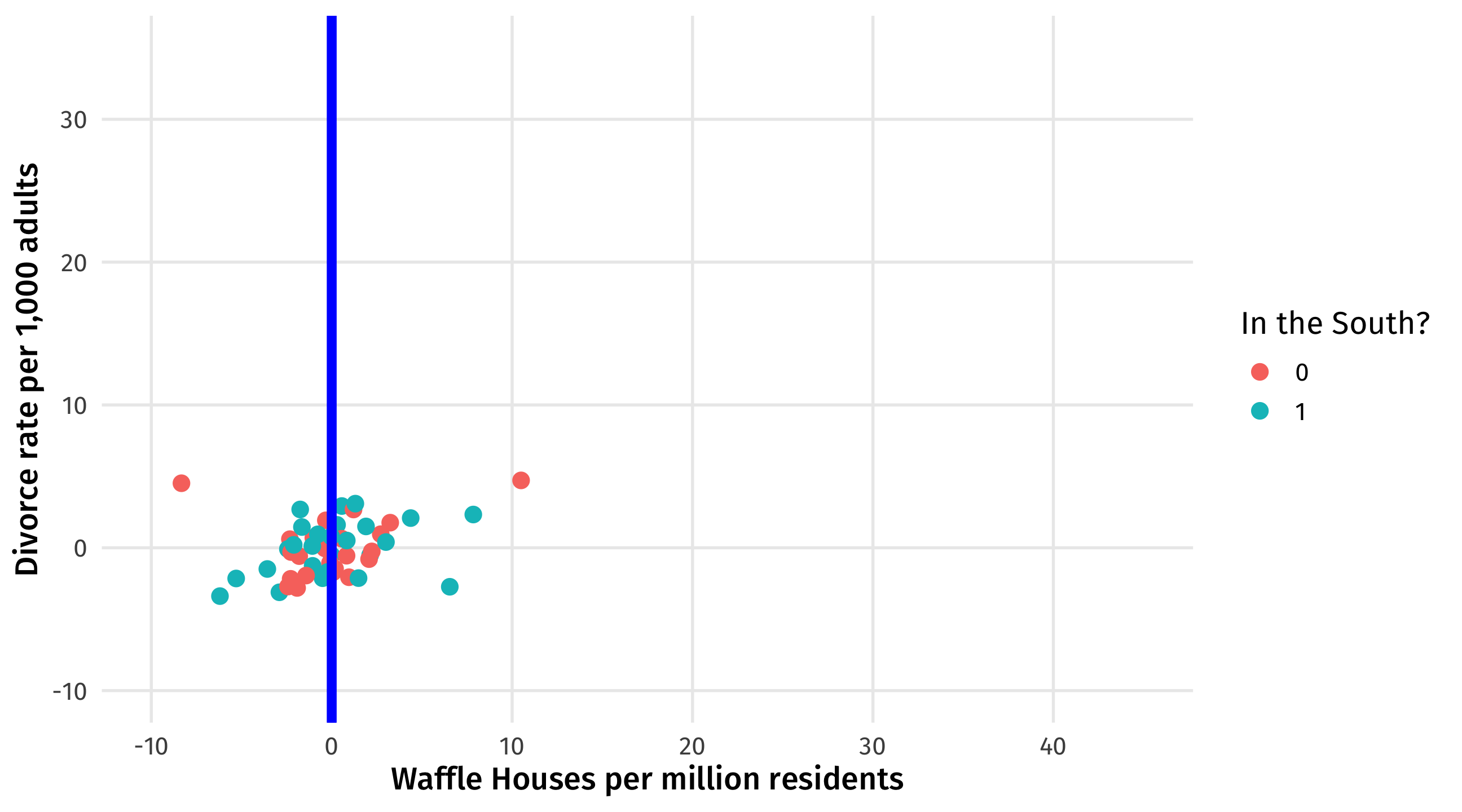 what’s left is the relationship between Waffles and Divorce, adjusting for the influence of the South on each