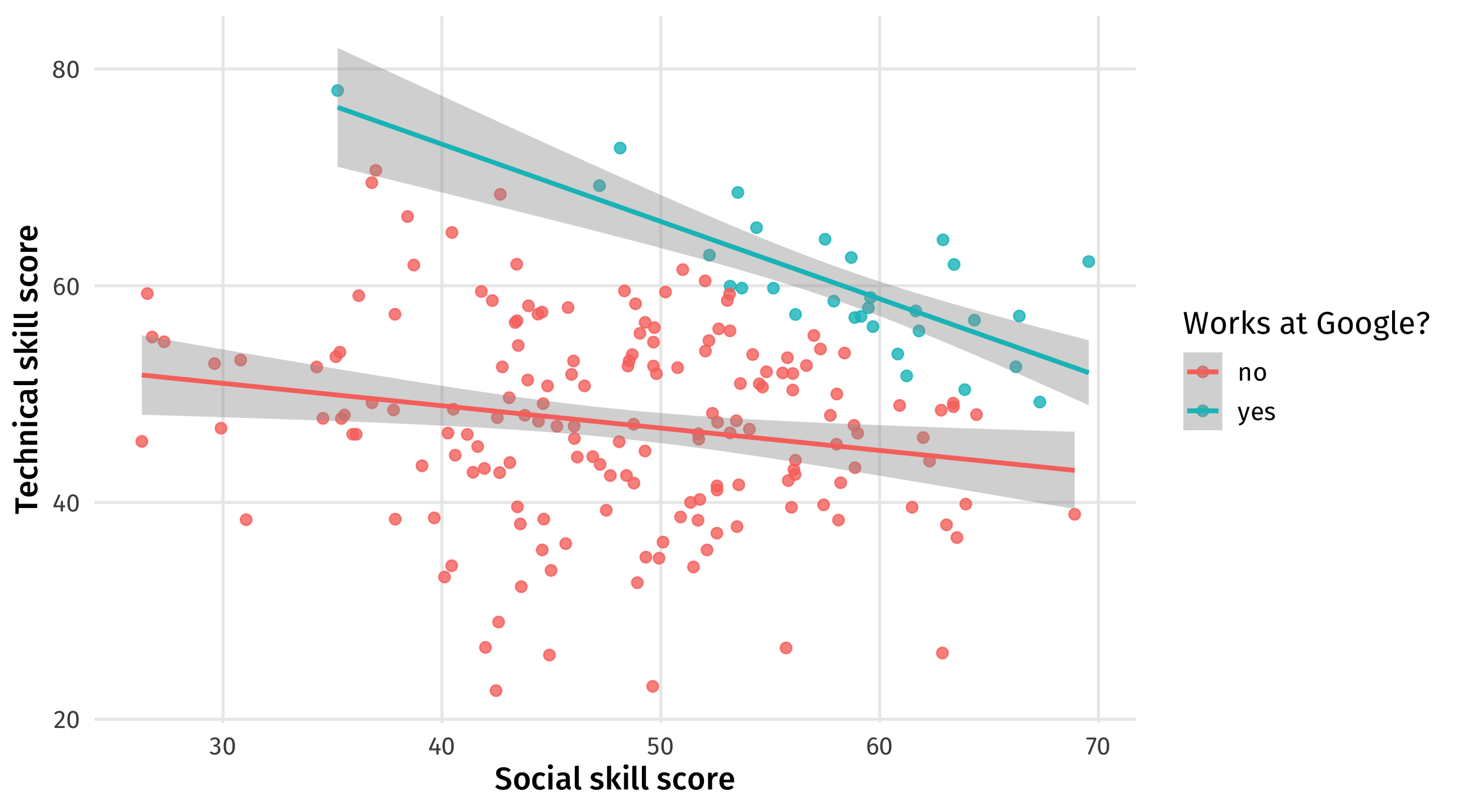 If we only look at Google workers we see a trade-off between social and technical skills:
