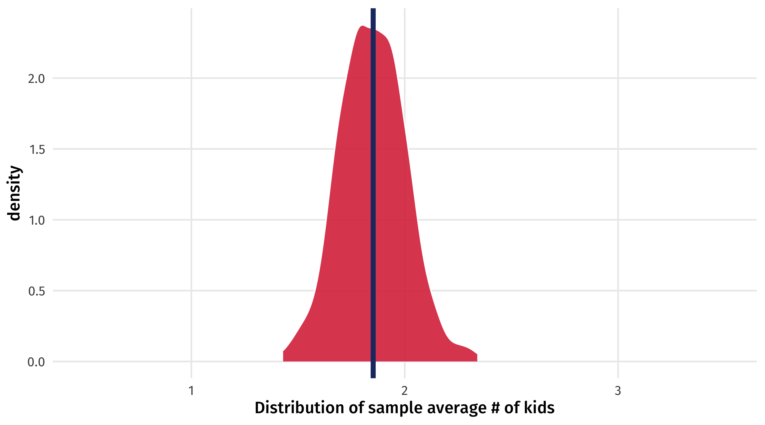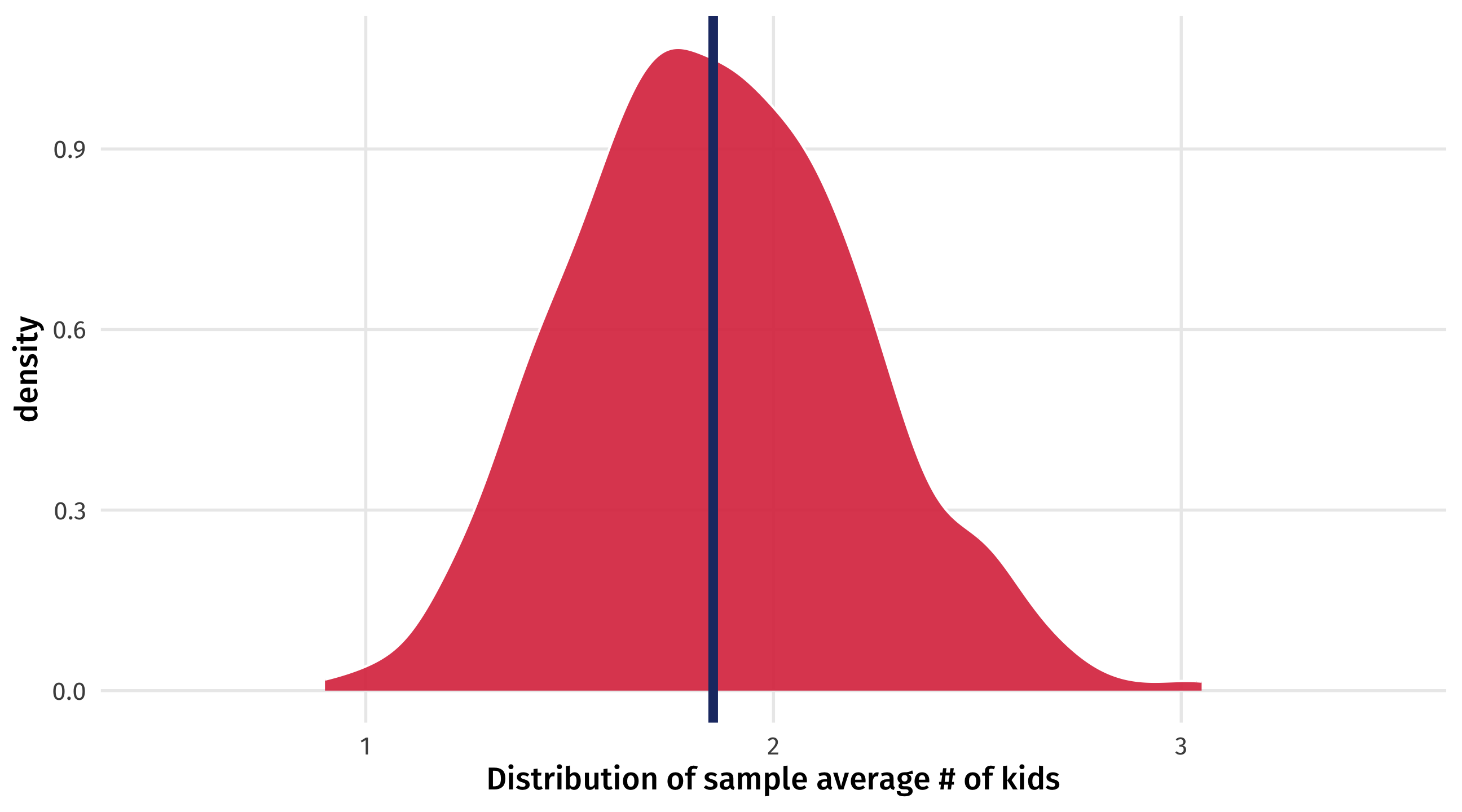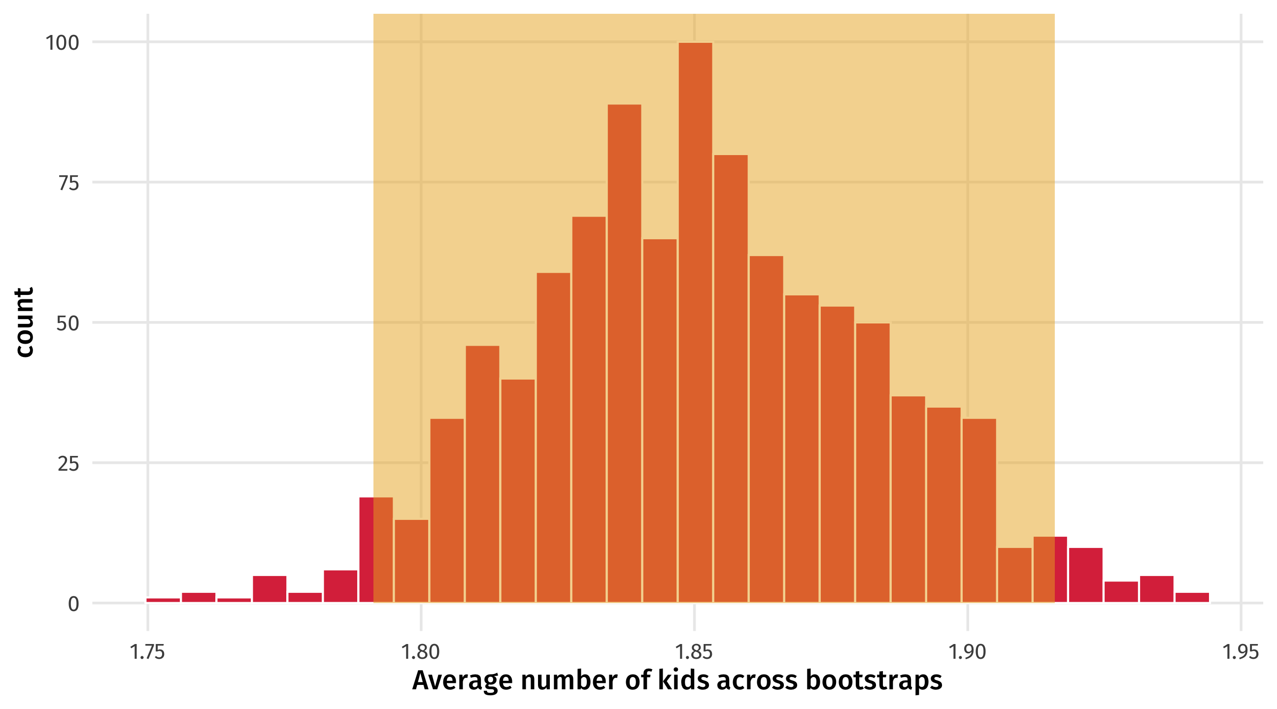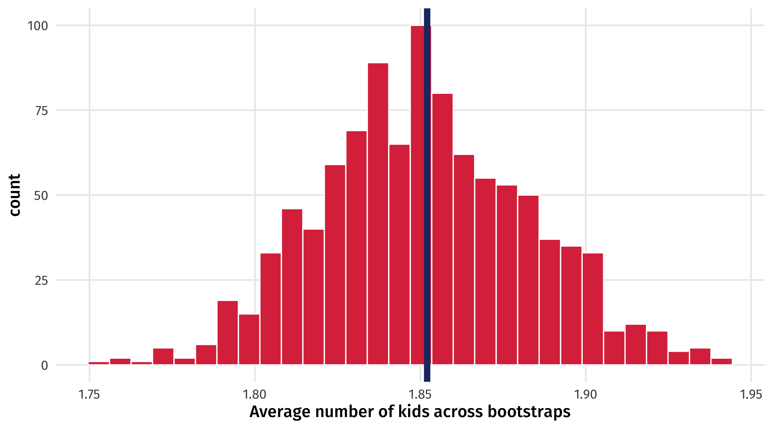 How uncertain should we be of our estimate of the avg. number of kids in the US, Given that it’s based on our one sample, gss_sm? We can bootstrap: