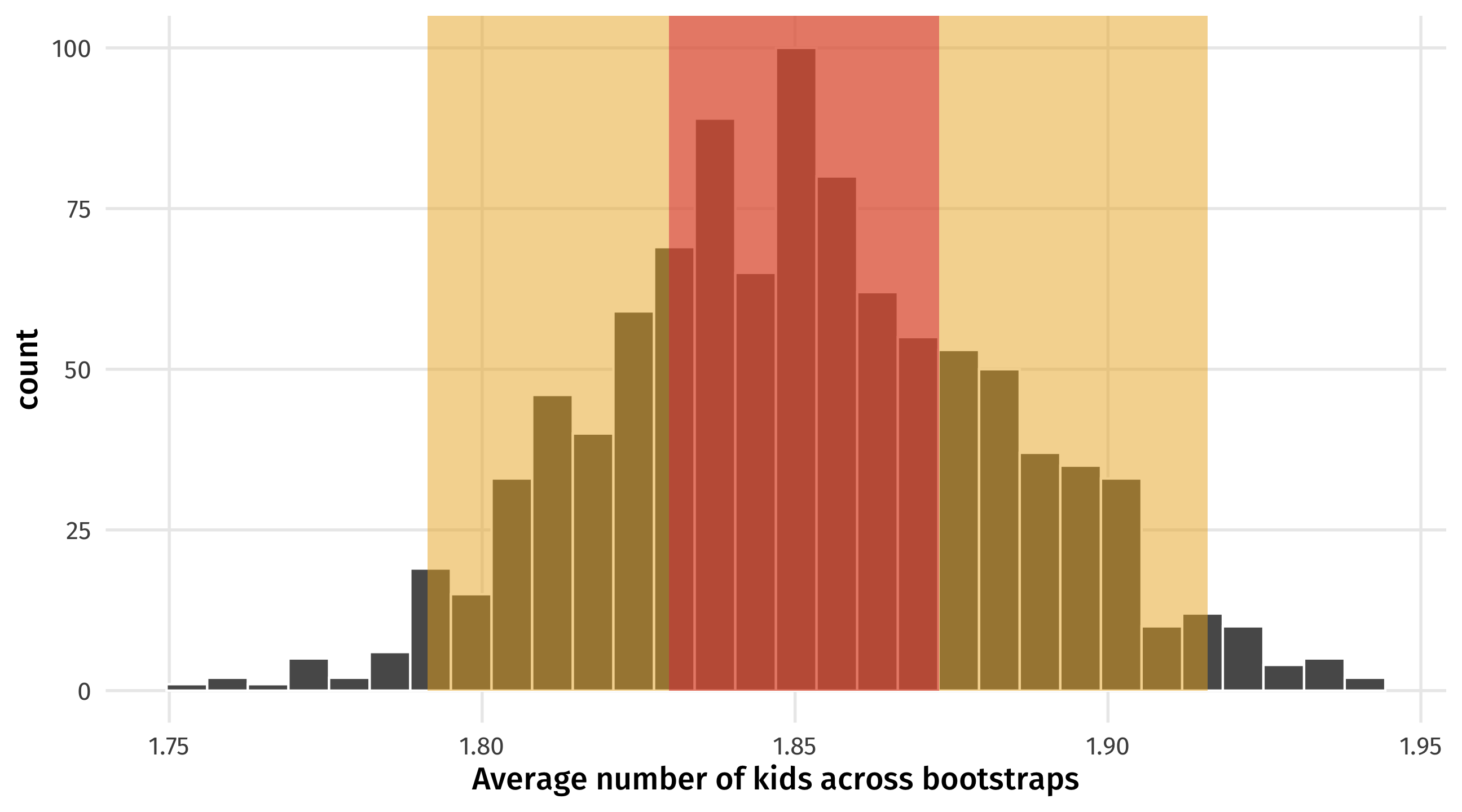 The red is the distribution of bootstrapped sample estimates \(\rightarrow\) the sampling distribution