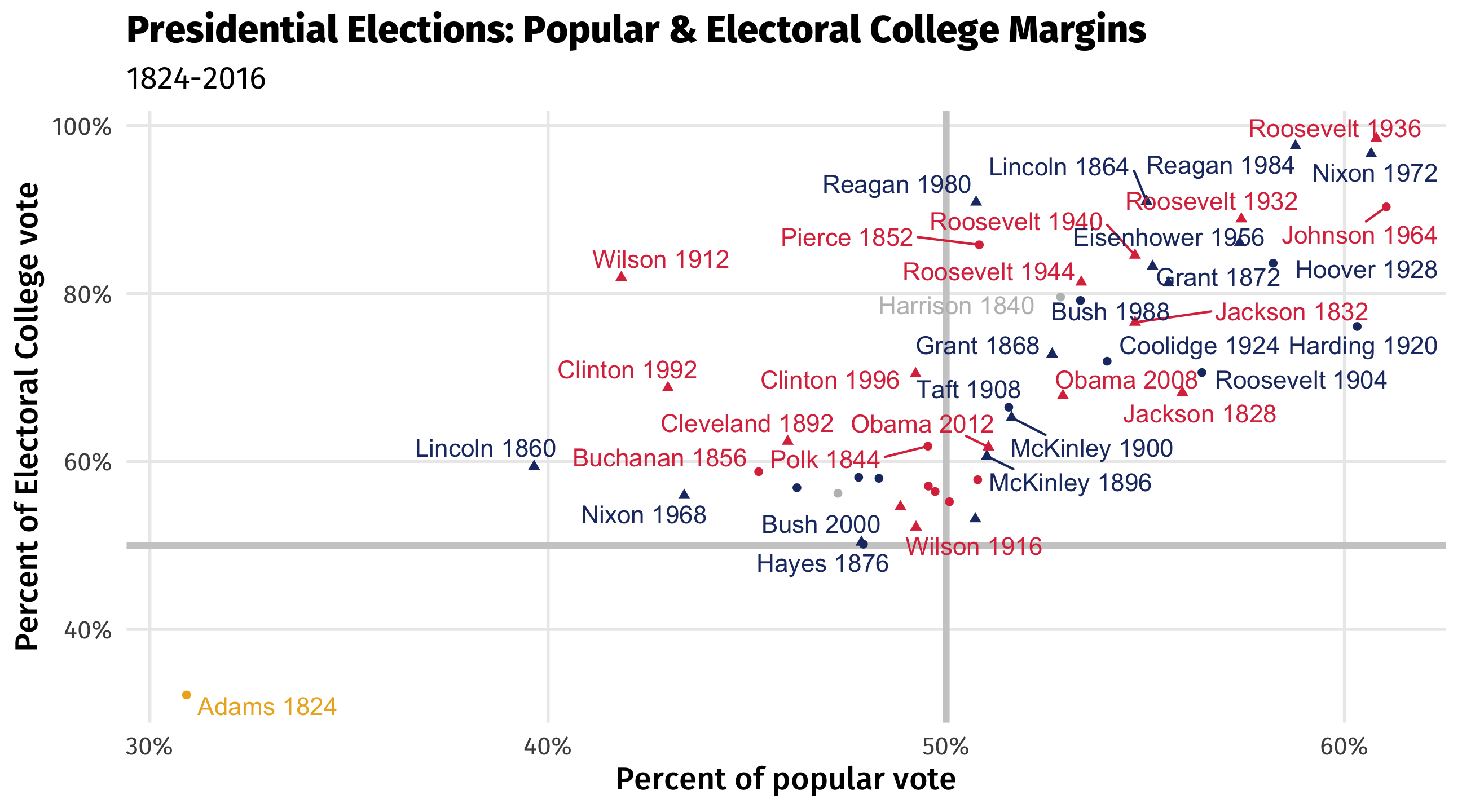 title = "Presidential Elections: Popular & Electoral College Margins", subtitle = "1824-2016",