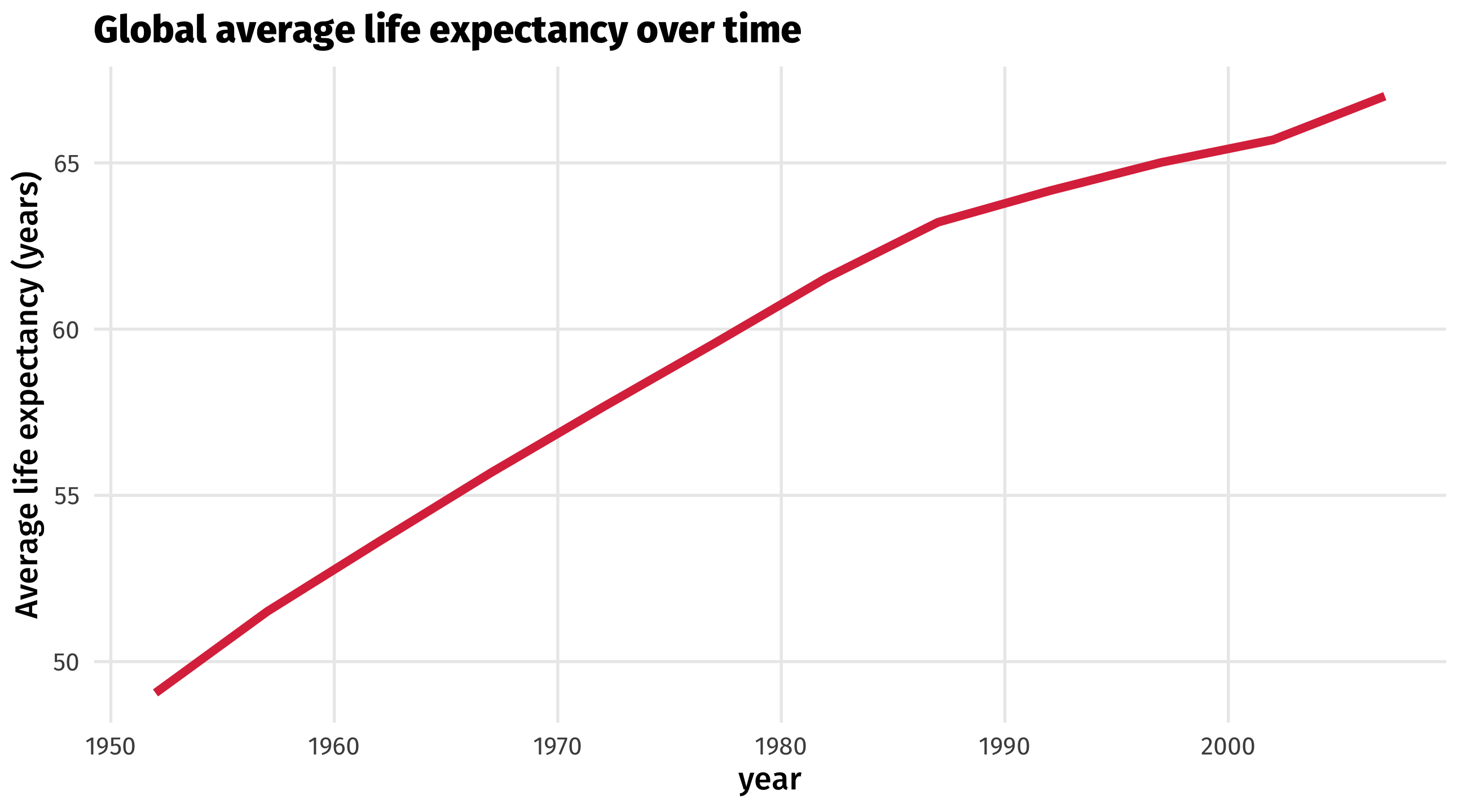 scale_color_manual(values = c(yellow, red, blue, "gray")) + theme(legend.position = "none")The time series uses a line to show you how a variable (y-axis) moves over time (x-axis)