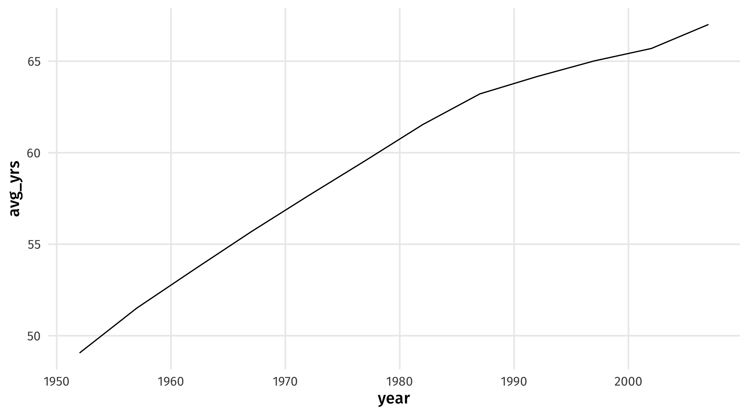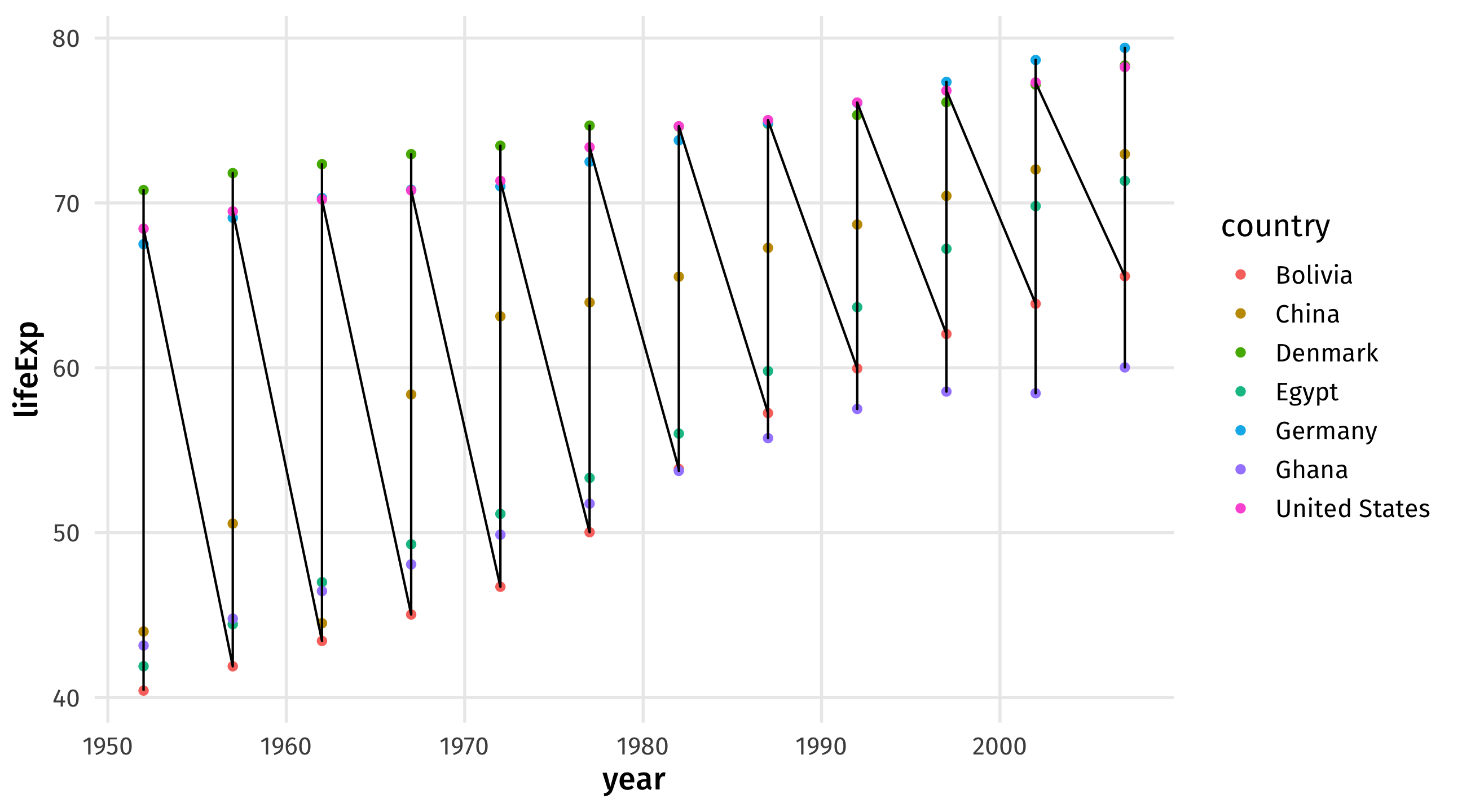 In each year we have multiple points (because multiple countries), ggplot() tries to connect them all