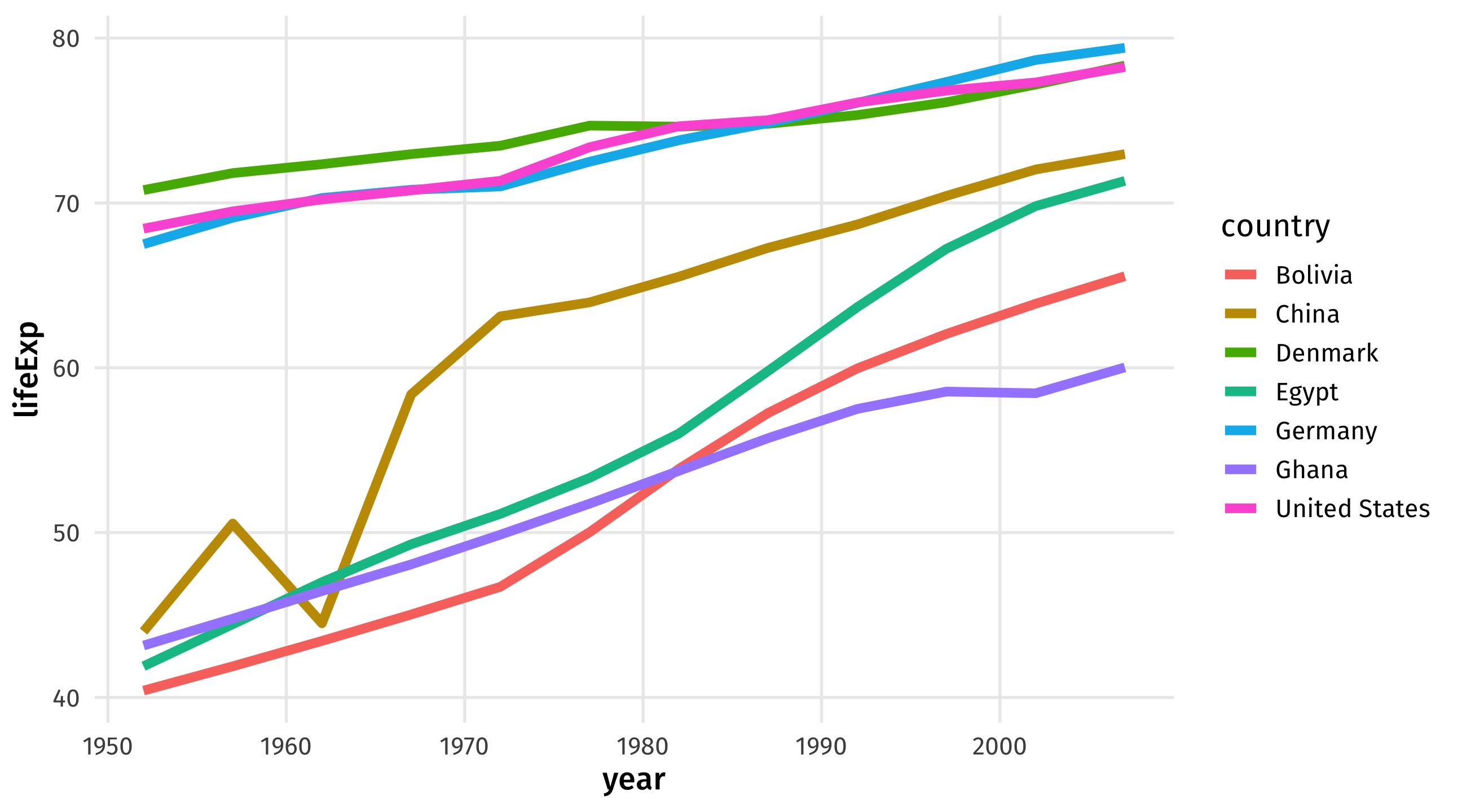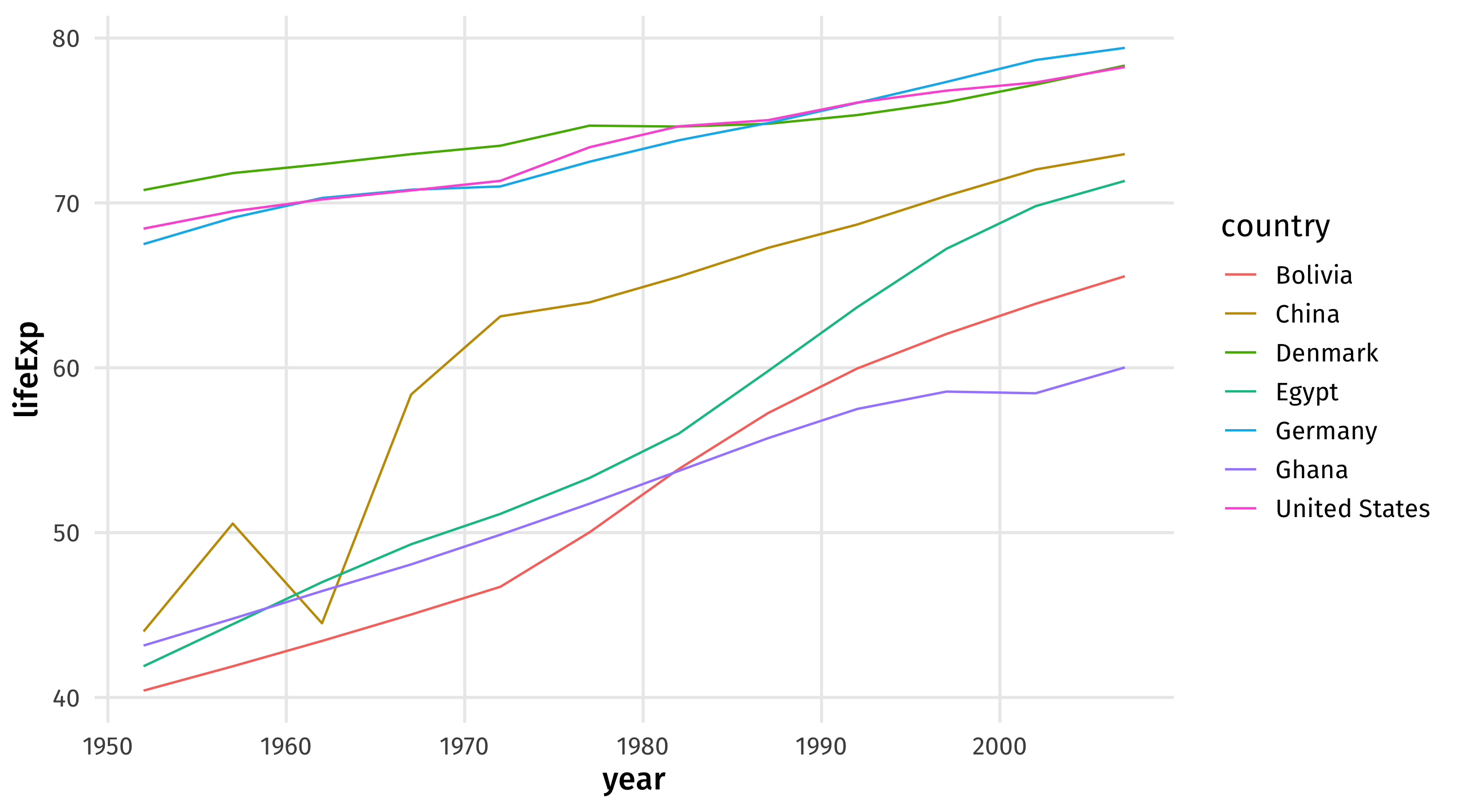 color to separate linesThese are useful for comparing trends across units (countries, places, people, etc)