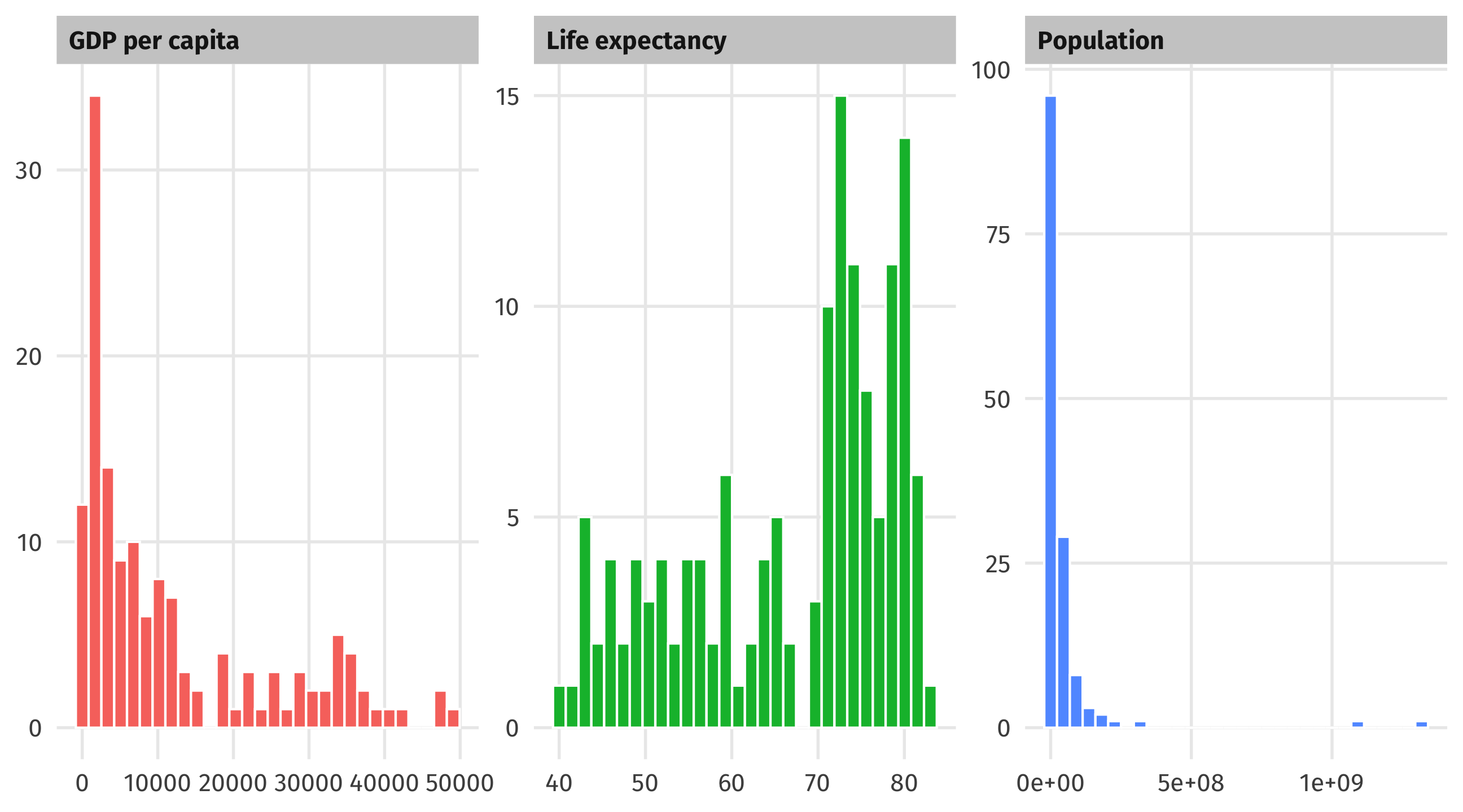 | Histogram | x = cont. variable | histogram() | Distributions |