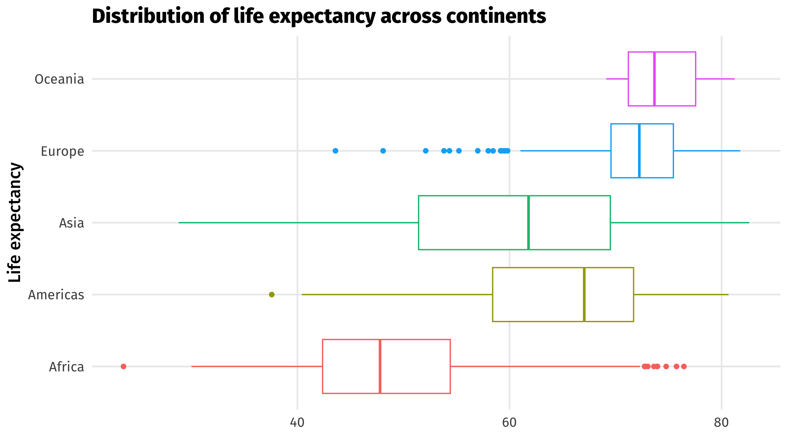| Boxplot | y = category, x = cont. variable | boxplot() | Compare distributions |