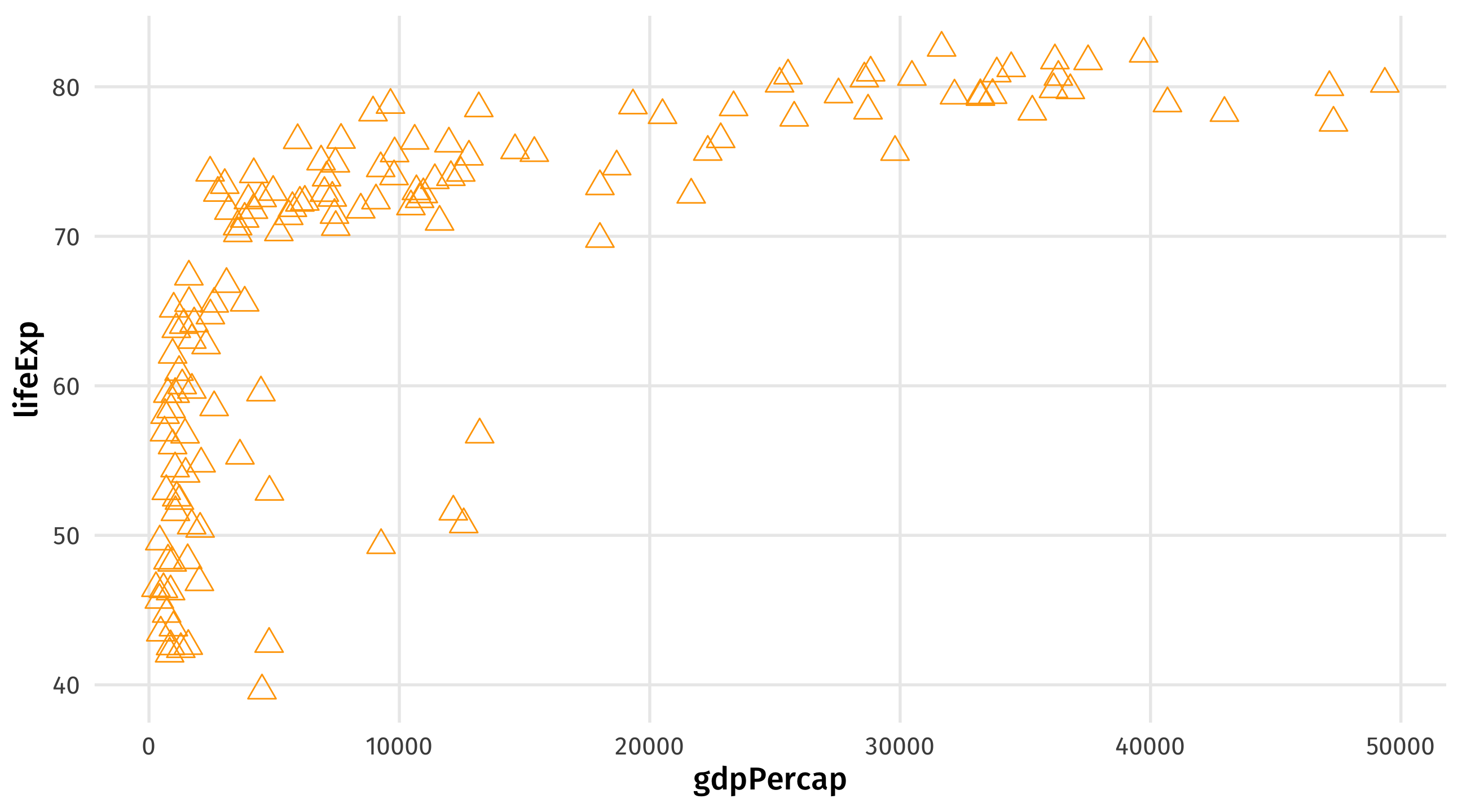 Change your geometries by adding arguments to geom_*(), like size, shape, color, etc.