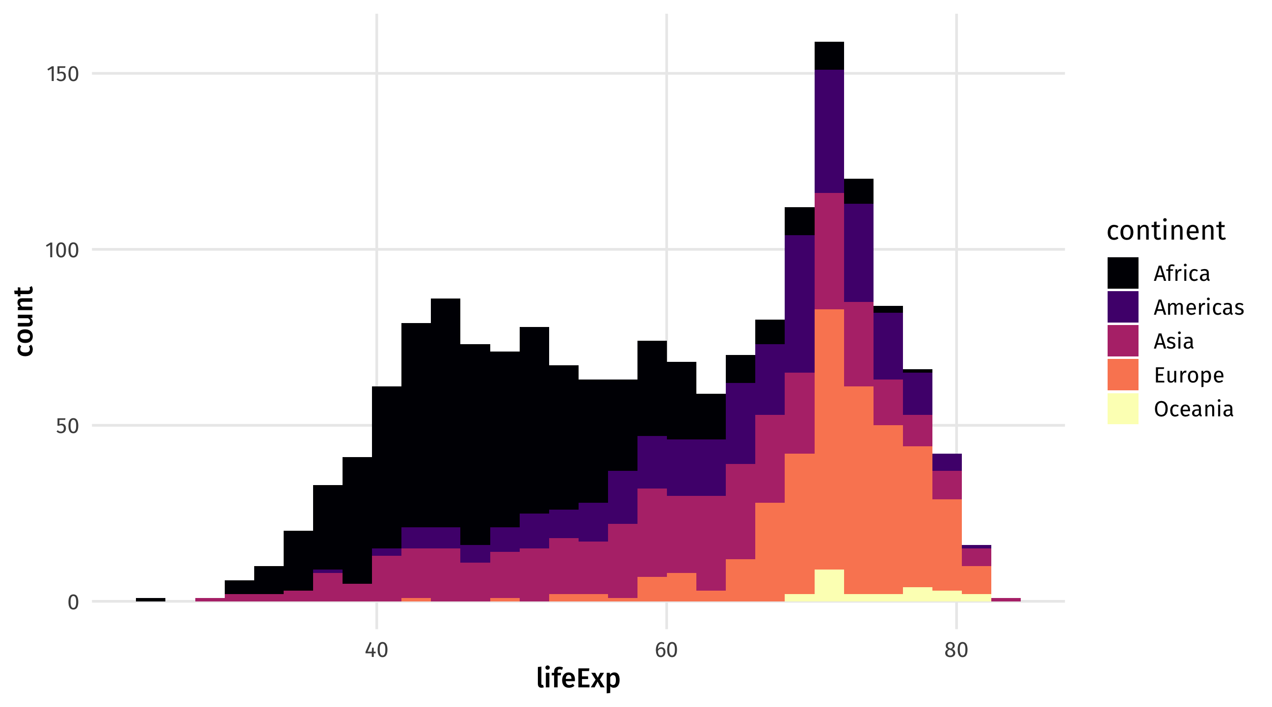 scale_fill_viridis_d for discrete variables, scale_fill_viridis_d for continuous