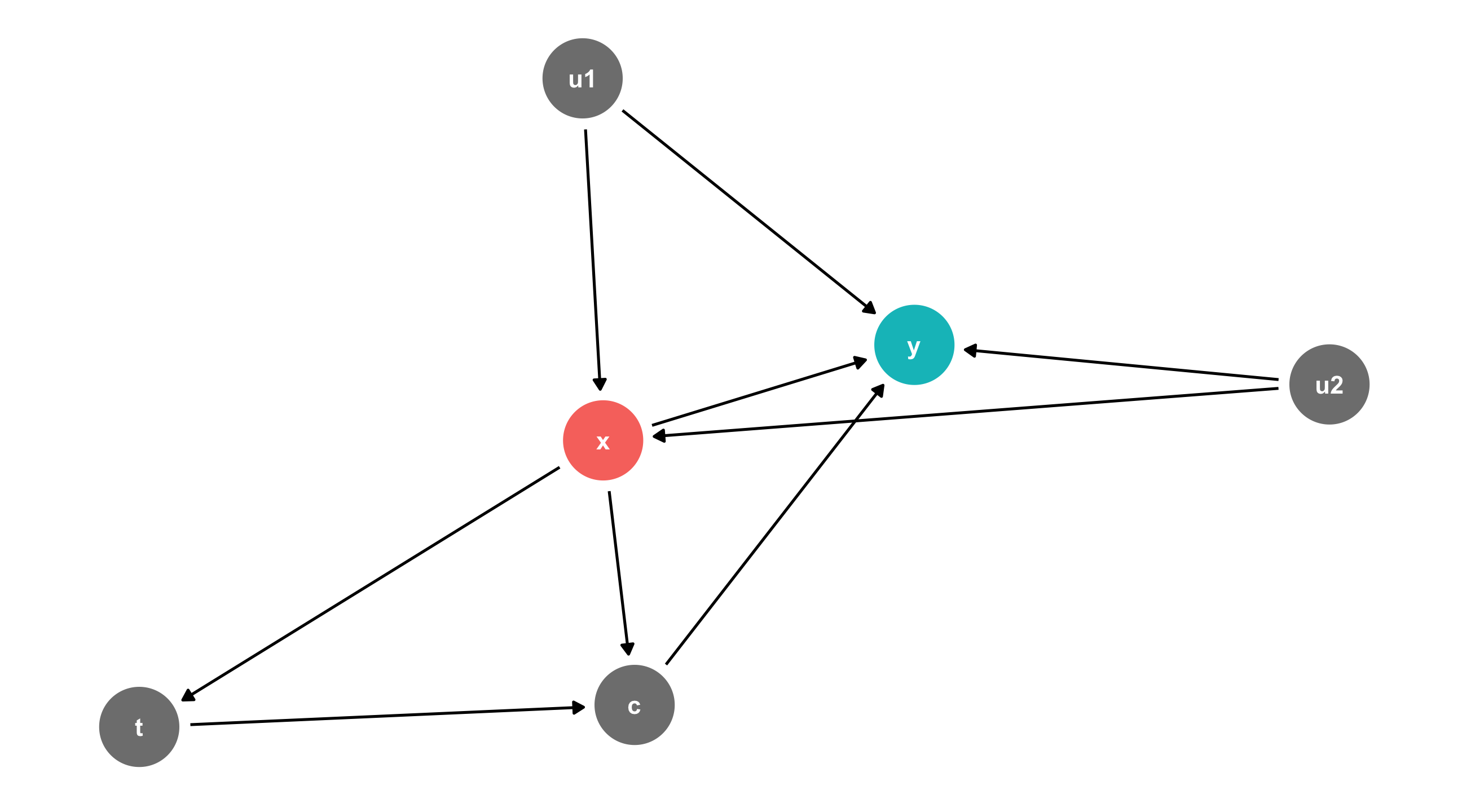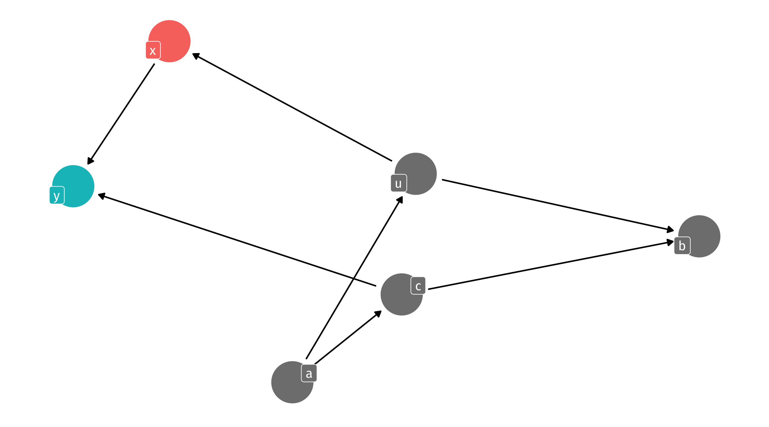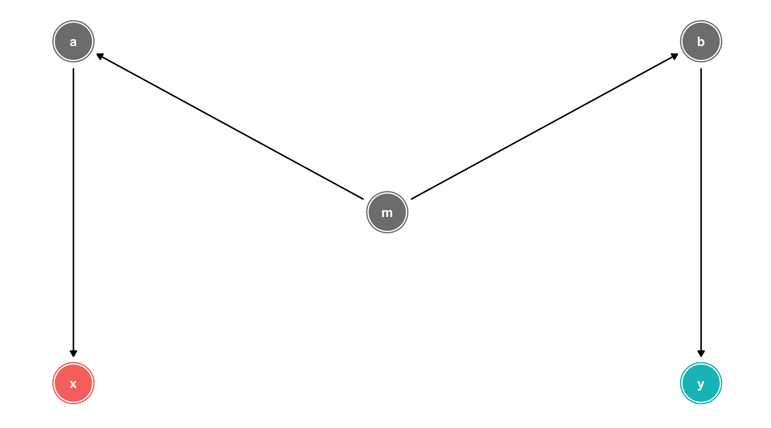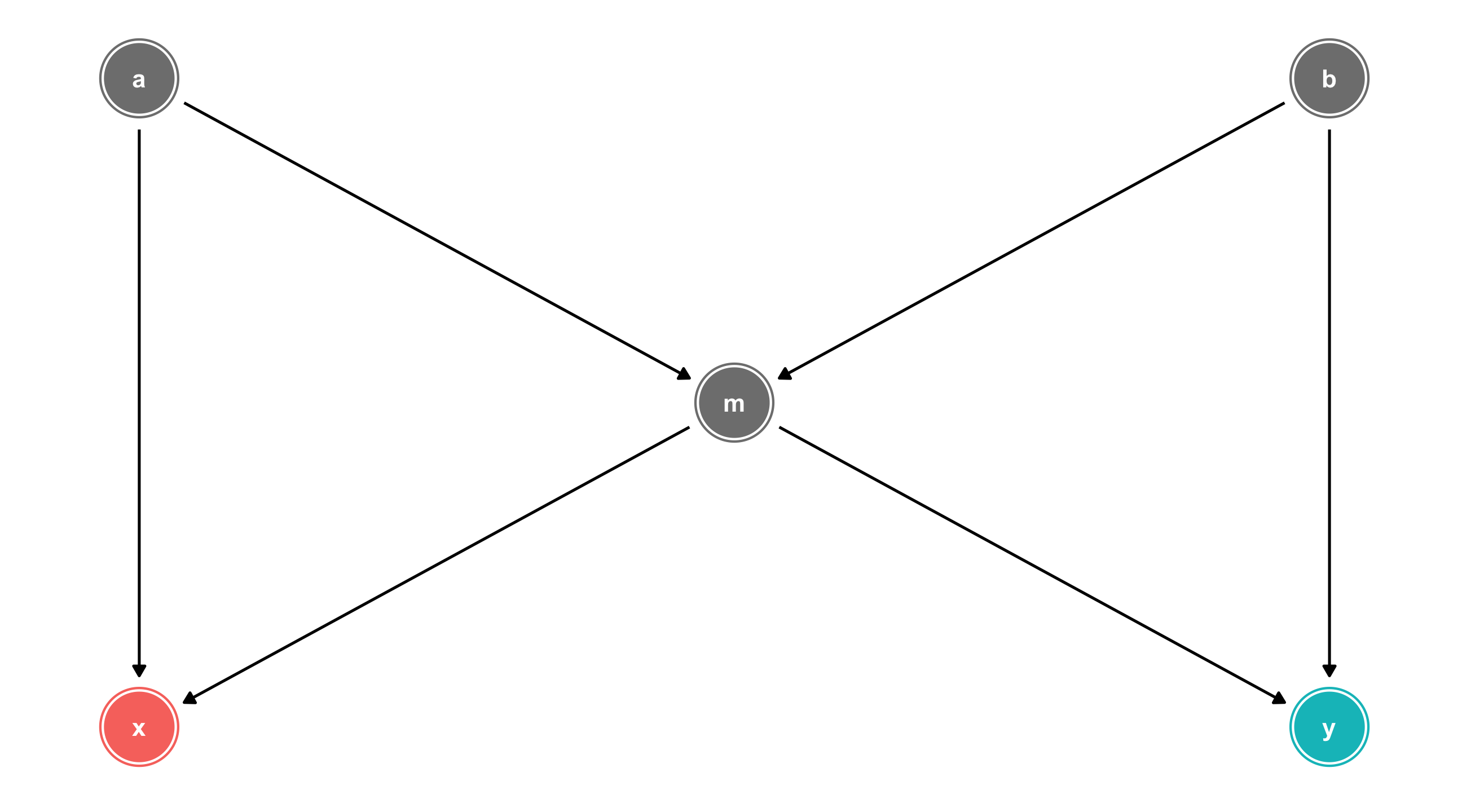 We can identify X \(\rightarrow\) Y by controlling for any variable in the backdoor path to break the chain: m, a, or b