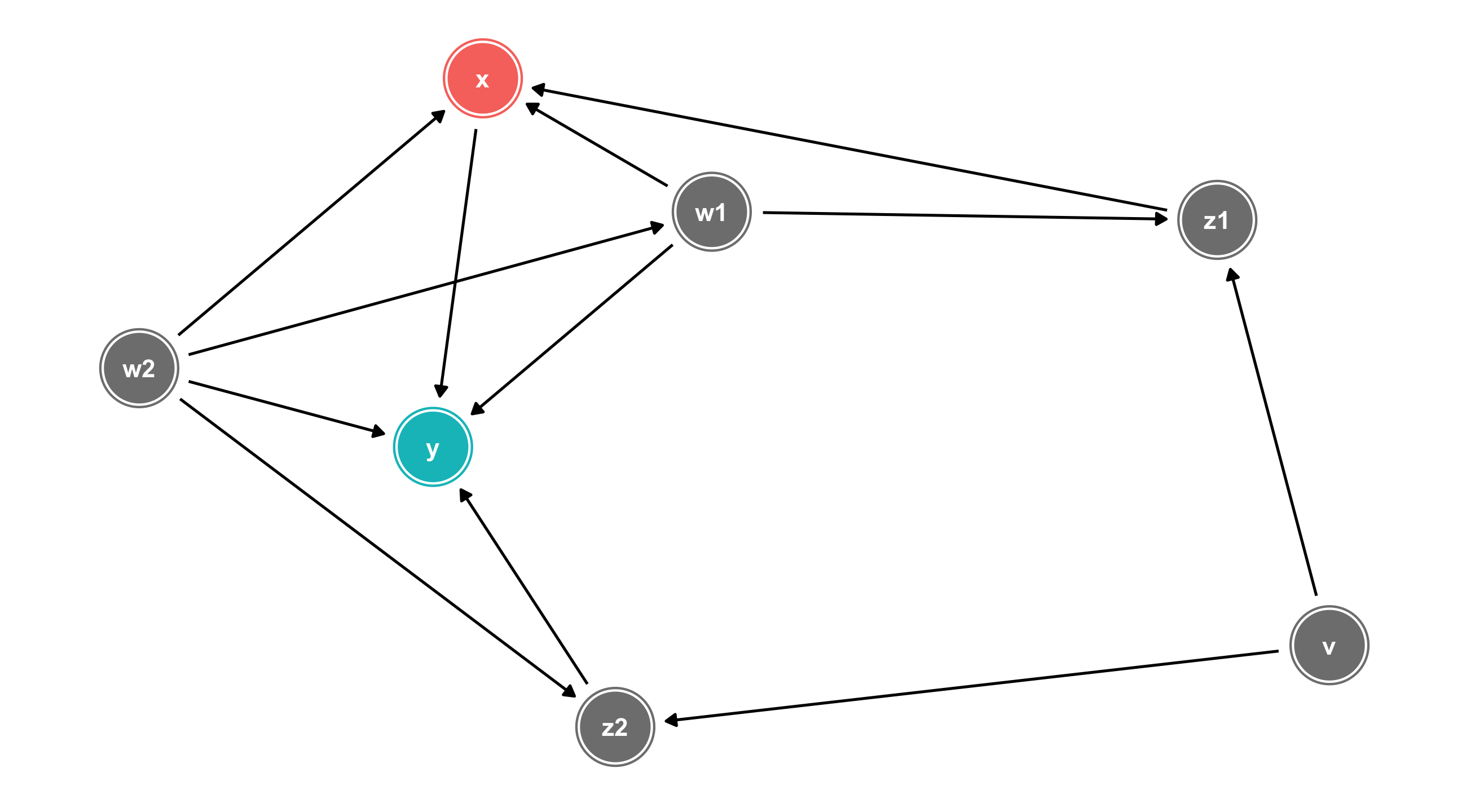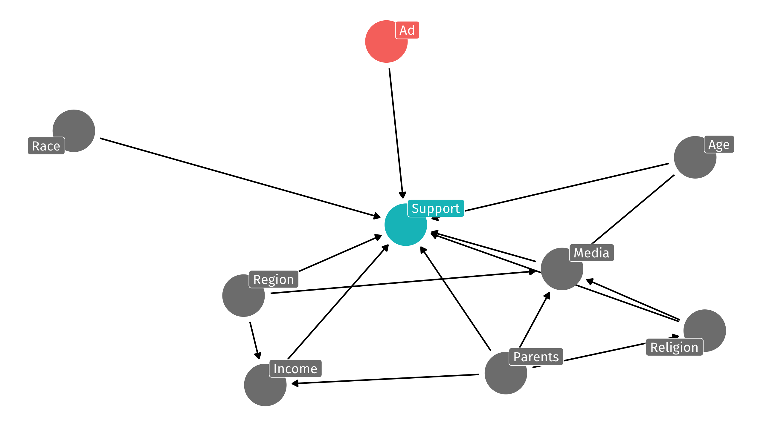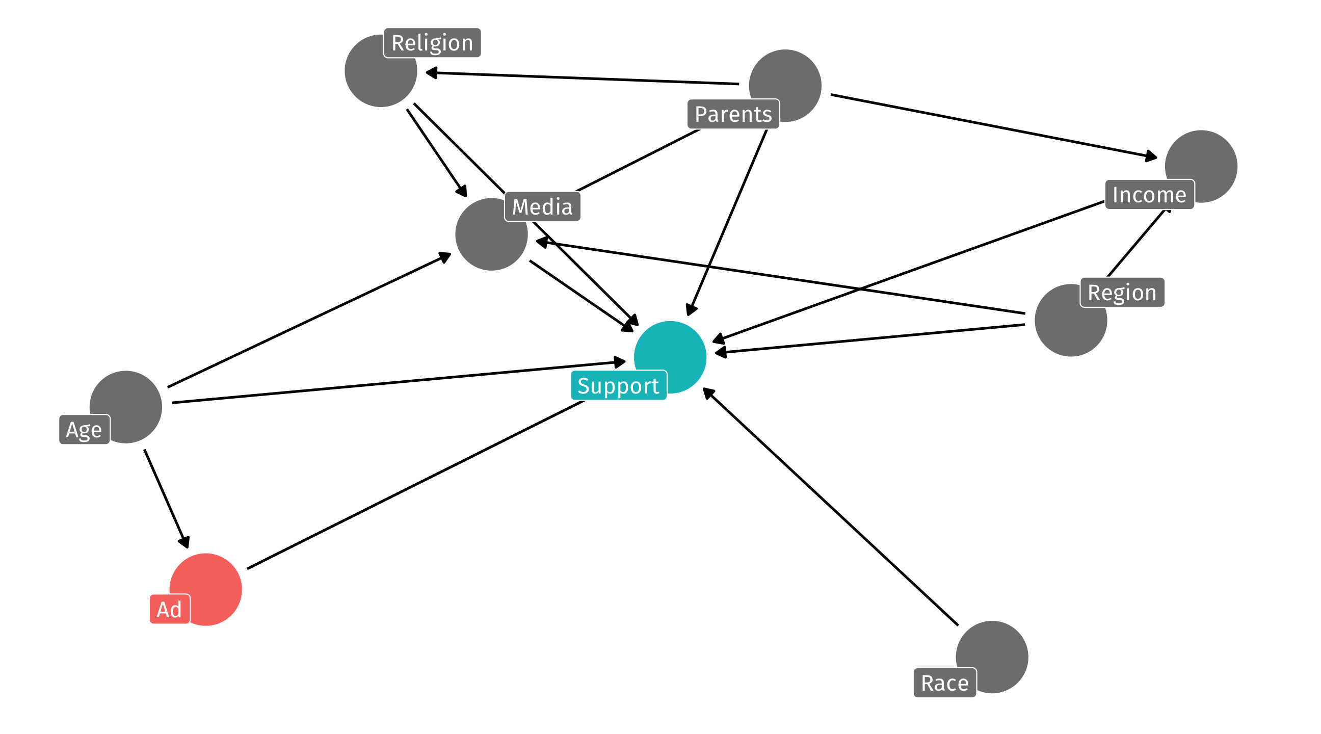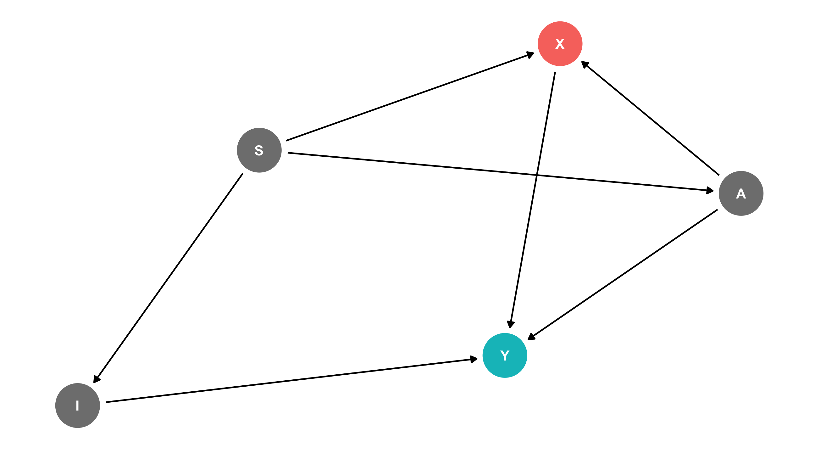 We can identify X \(\rightarrow\) Y by controlling for any variable in the backdoor path to break the chain: m, a, or b