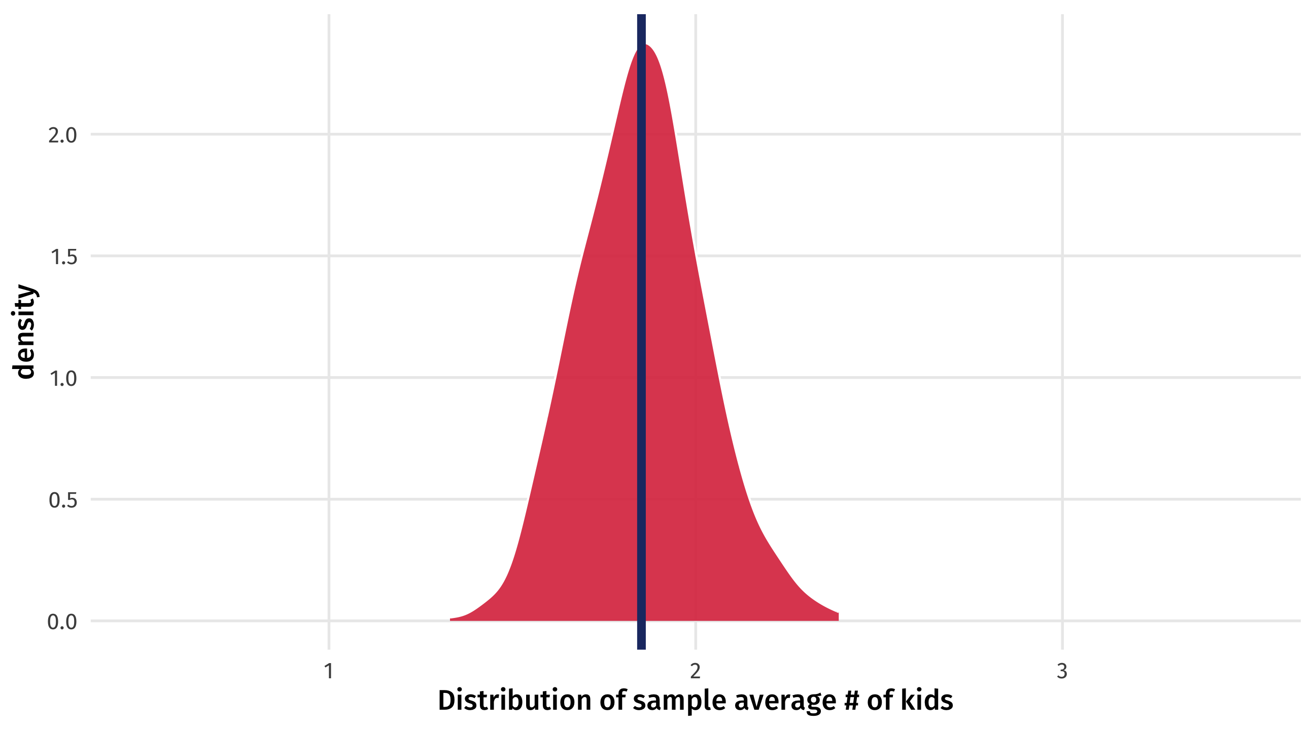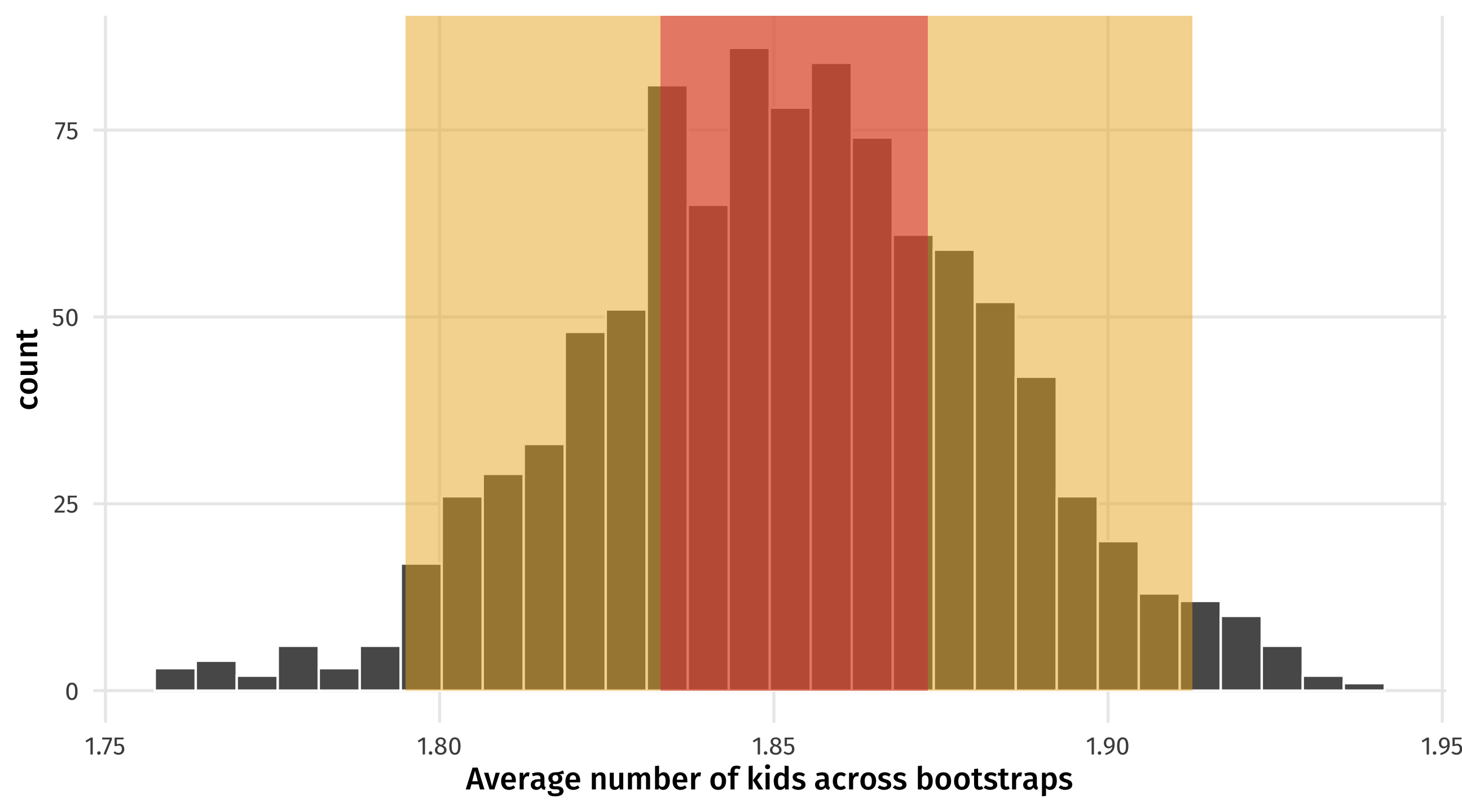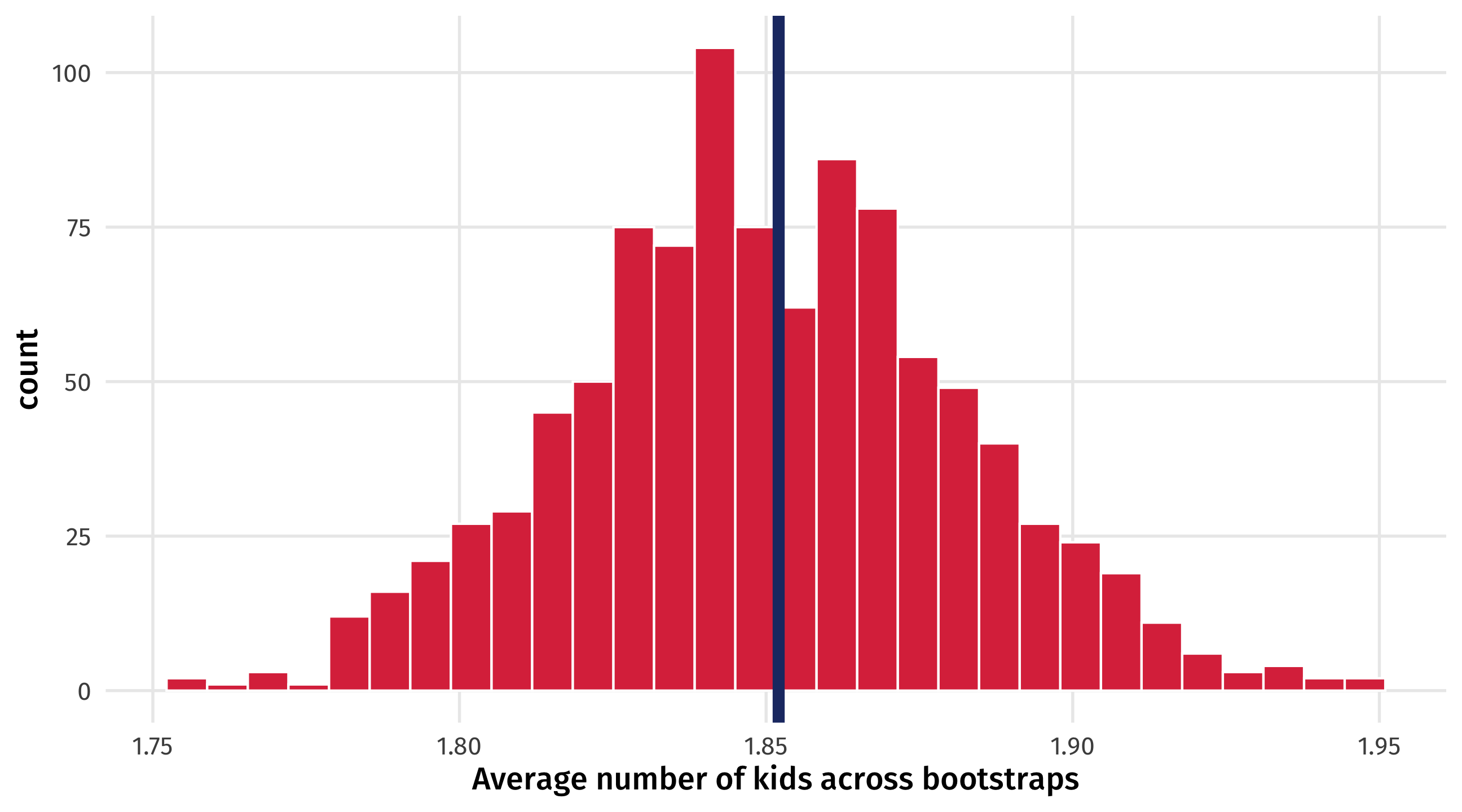 How uncertain should we be of our estimate of the avg. number of kids in the US, Given that it’s based on our one sample, gss_sm? We can bootstrap: