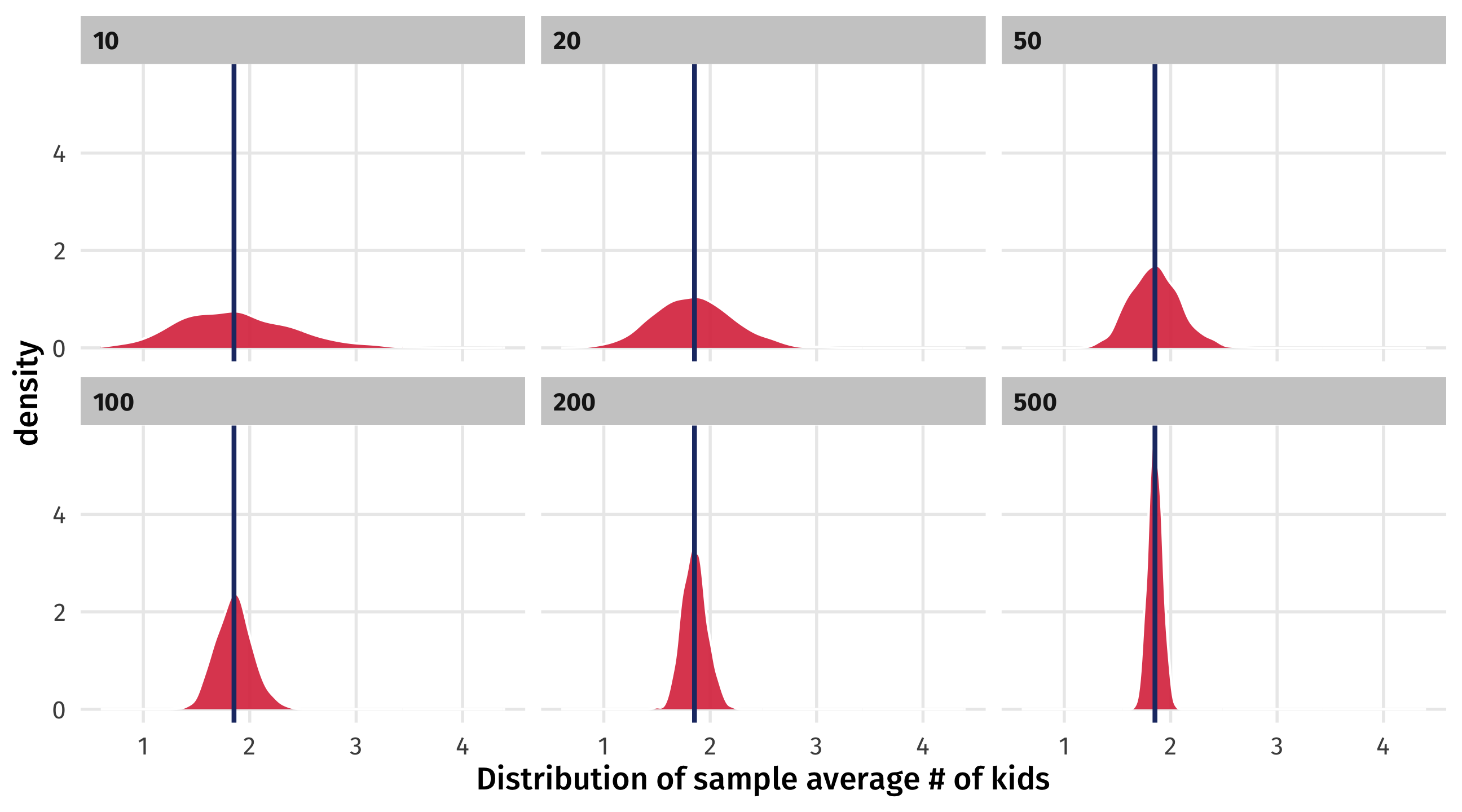 You are 50% “confident” that avg. number of kids could vary between 1.83 and 1.87. Narrower range! But low confidence!